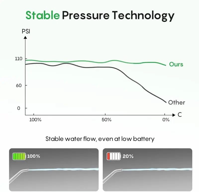 ·Constant Pressure Technology – Power That Never Drains: Unlike conventional cordless flossers that lose pressure as the battery depletes, our innovative technology ensures a consistently stable and optimal water stream from the first use to the 50th day. Enjoy a reliable, comfortable, and powerful clean every single time, guaranteed.