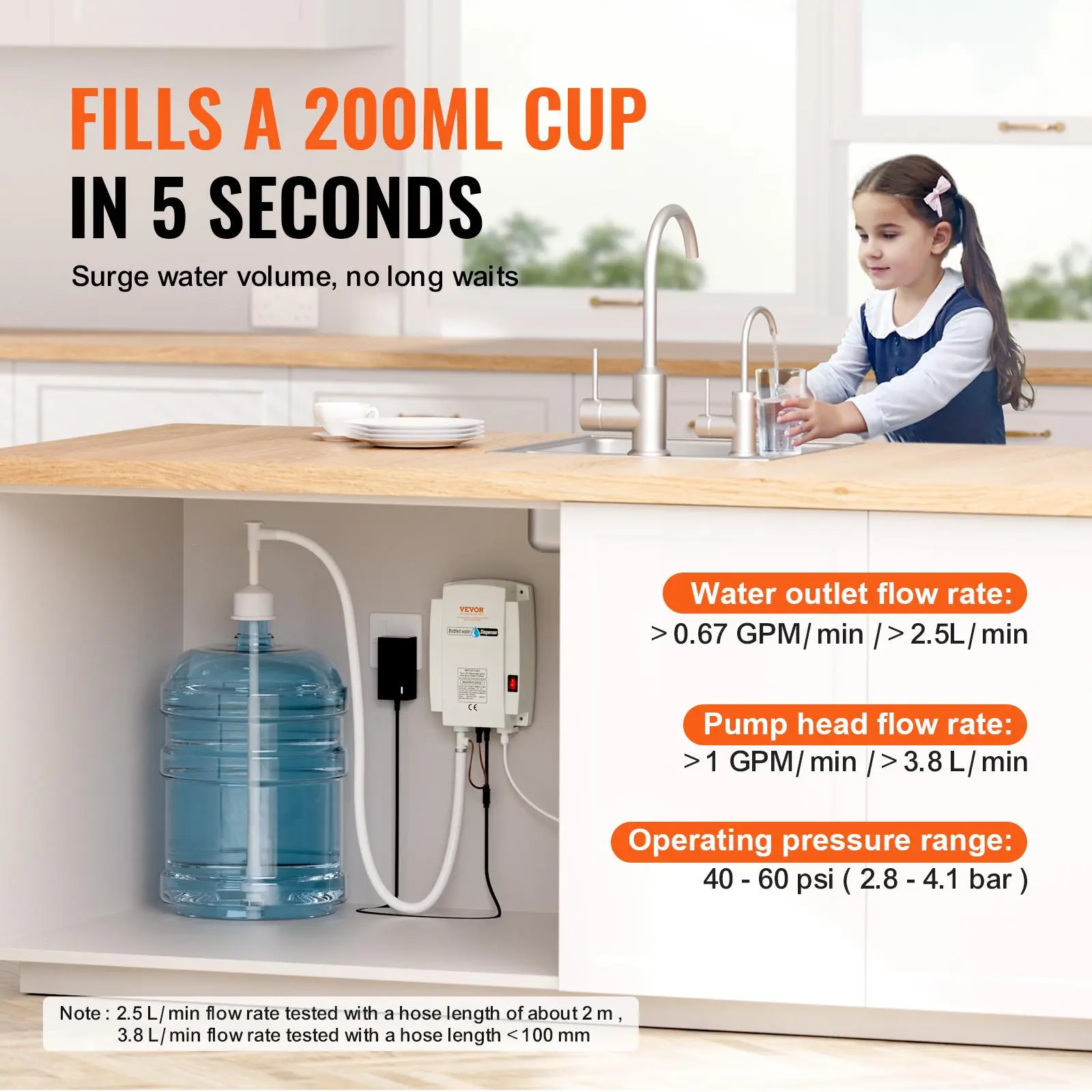 • Superior Performance: This bottled water dispenser pump boasts powerful performance, with a working pressure range of 40-60 PSI (2.8-4.1 bar) and a water outlet flow rate of 0.67GPM (2.5L/min), ensuring quick and stable provision of ample drinking water, meeting your drinking water needs anytime, anywhere.