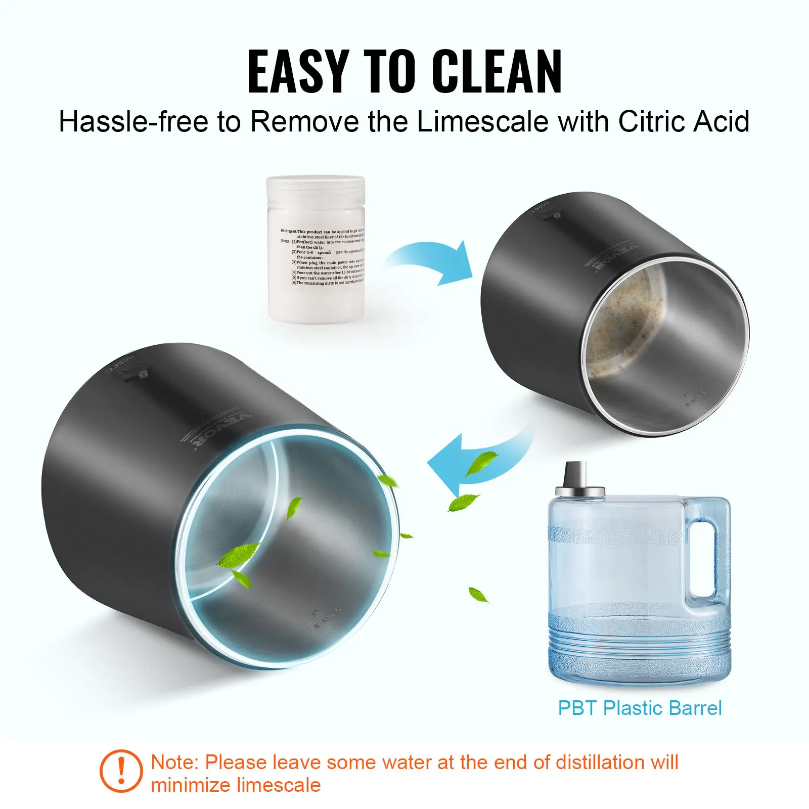 • High-Quality Materials: The distilled water maker features a 304 stainless steel interior water tank. The storage tank is made of PBT plastic , with all parts in contact with water being of food-grade safe materials.