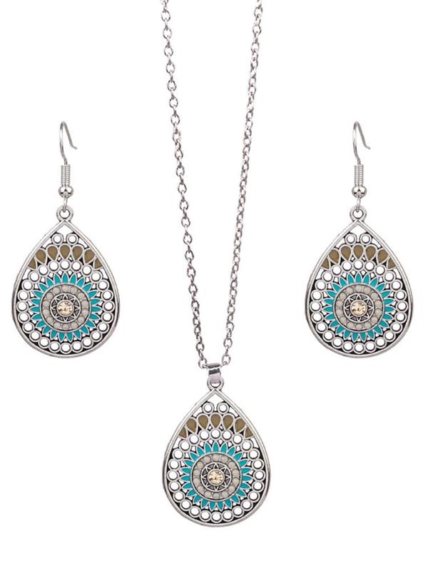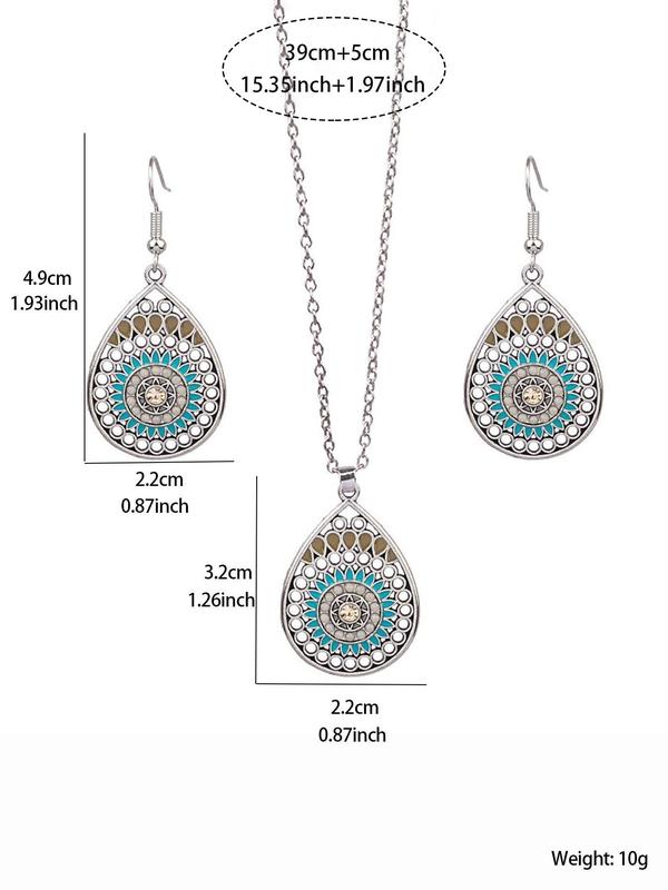 Love it. Necklace hits right at collarbone. Earrings are light on the ears.