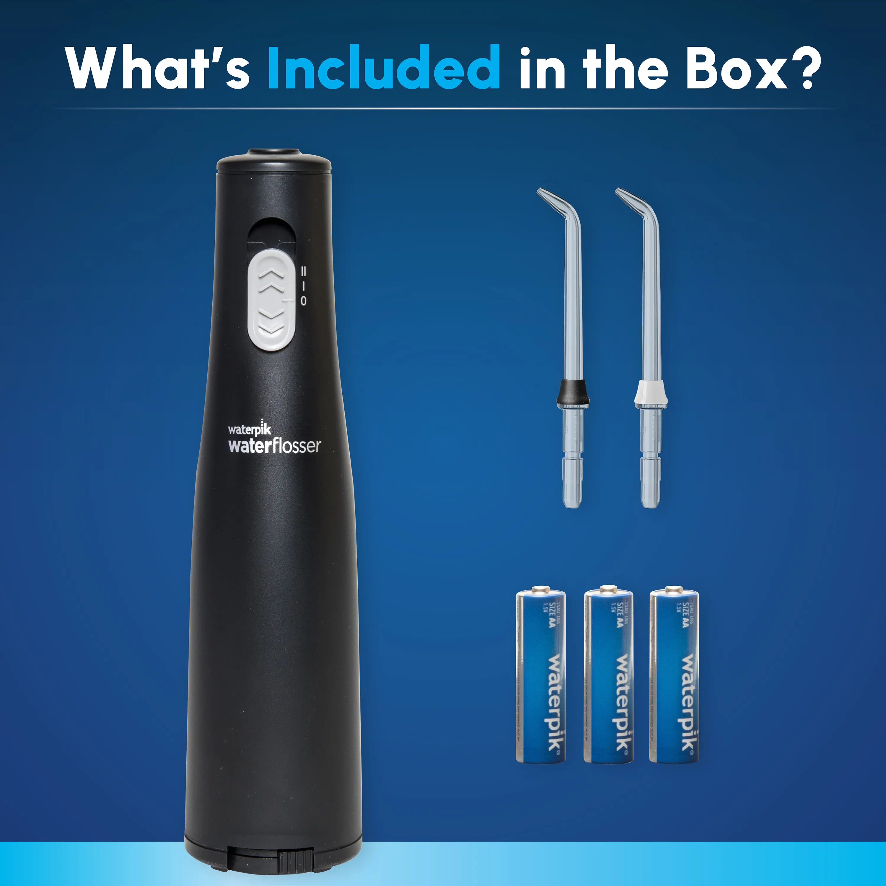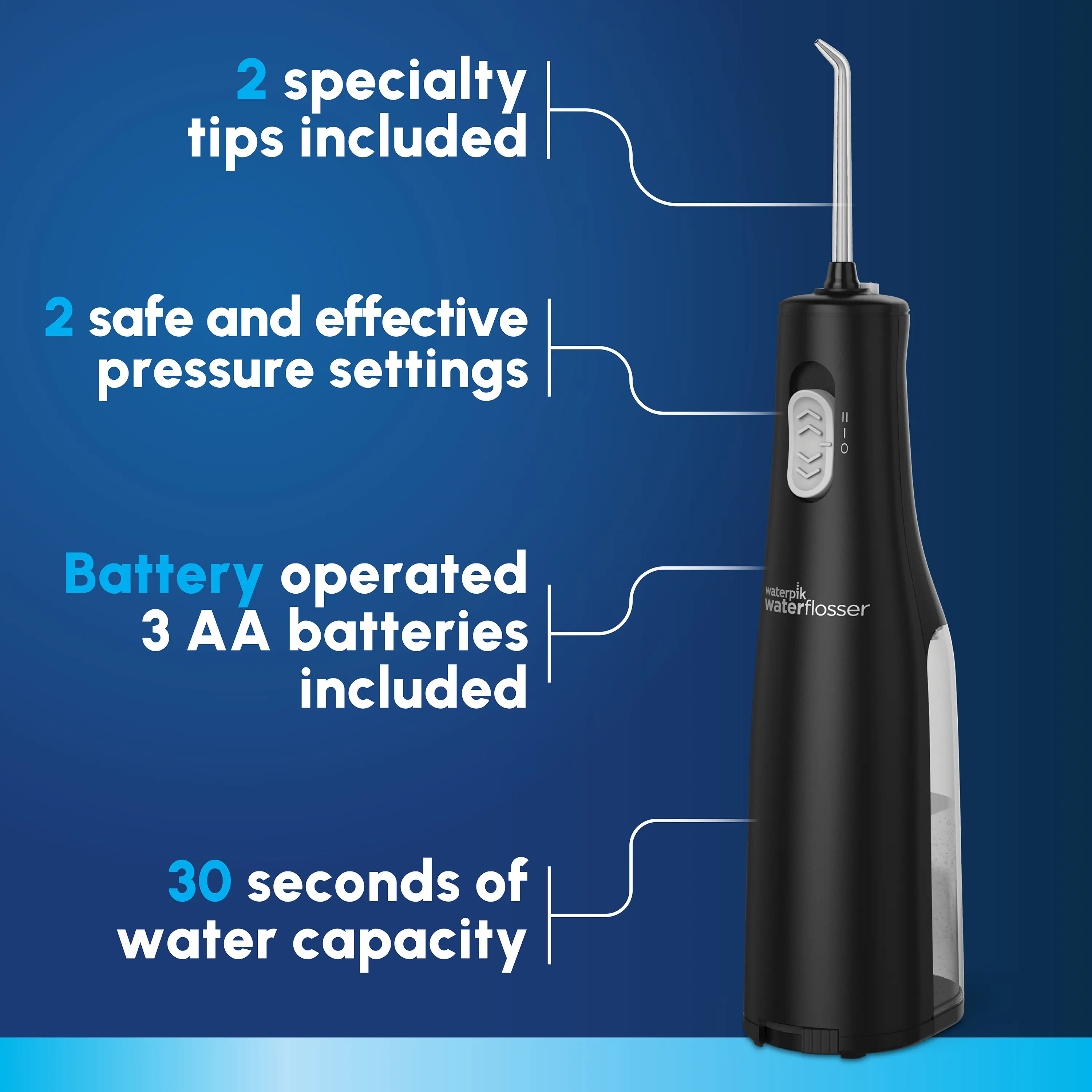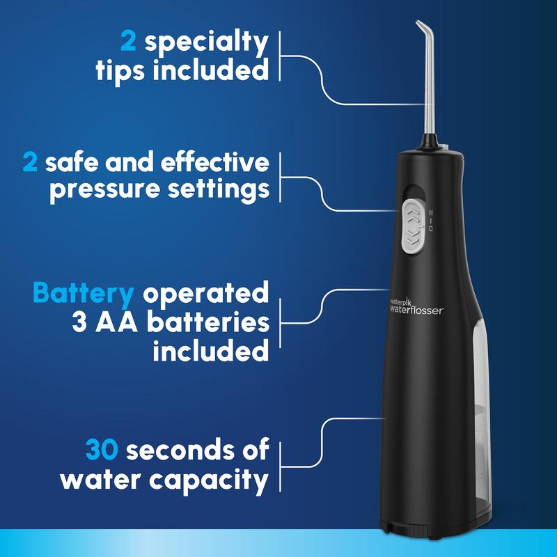 ·KEY FEATURES: 2 flossing tips, 2 pressure settings, removable 5 oz reservoir (top-rack dishwasher safe for easy cleaning), up to 30 seconds of flossing time, 3 AA replaceable batteries, waterproof for shower use.