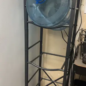 This water jug stand is constructed of durable metal and particleboard, with an X-shaped metal bar on the back, adjustable feet for enhanced stability.