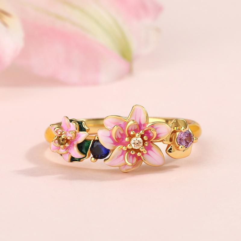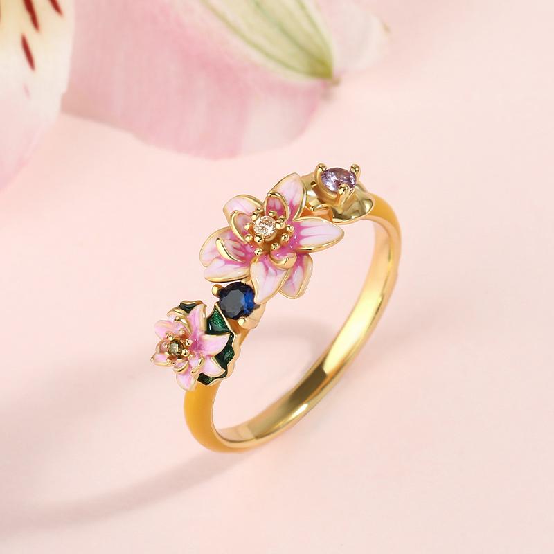 This ring reimagines Monet's "Water Lilies" into an artistic treasure. It features charming lotuses in bright enamel shades. The intricate enamel work and sparkling stones make it eye-catching. The ring encapsulates peace and harmony, looking beautiful alone or layered. The designer added dragonflies, inspired by Monet's imagination.