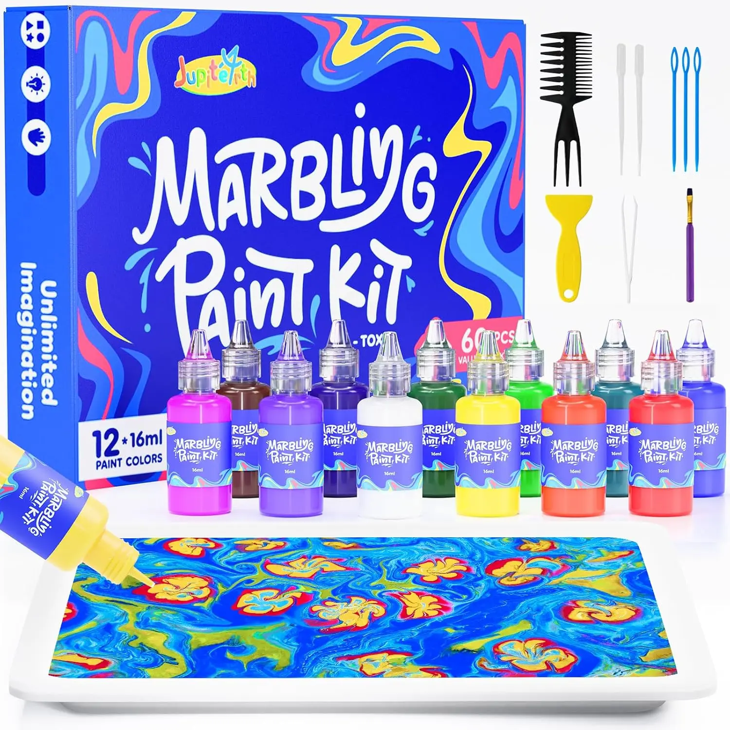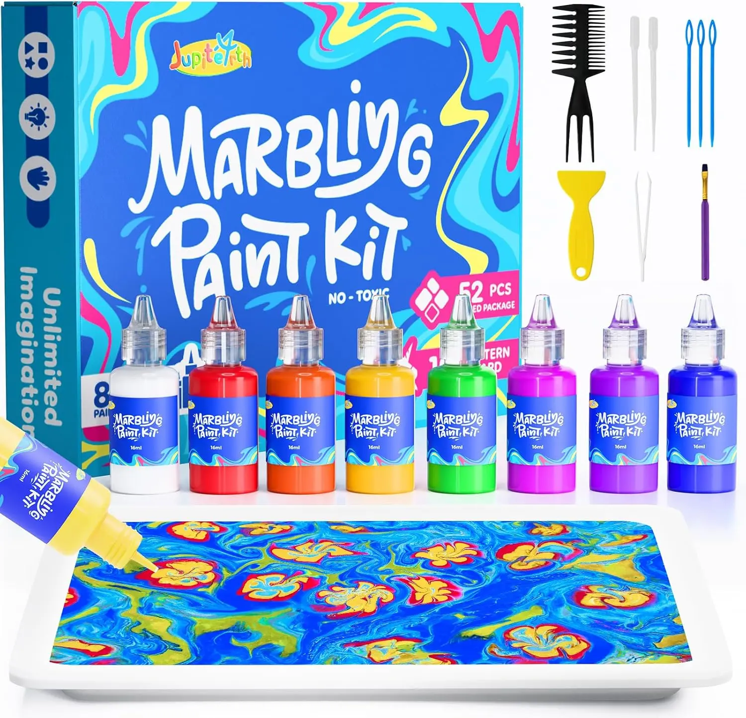 Safe and Non-Toxic: The JUPITEARTH Water marbling paint kit is Non-toxic. It comes with 8 individually packaged bags of carrageenan powder. Simply mix the powder with 500ml of water, stir gently, and let it sit for 6 hours. This allows kids to fully enjoy the process and the fun of marbling