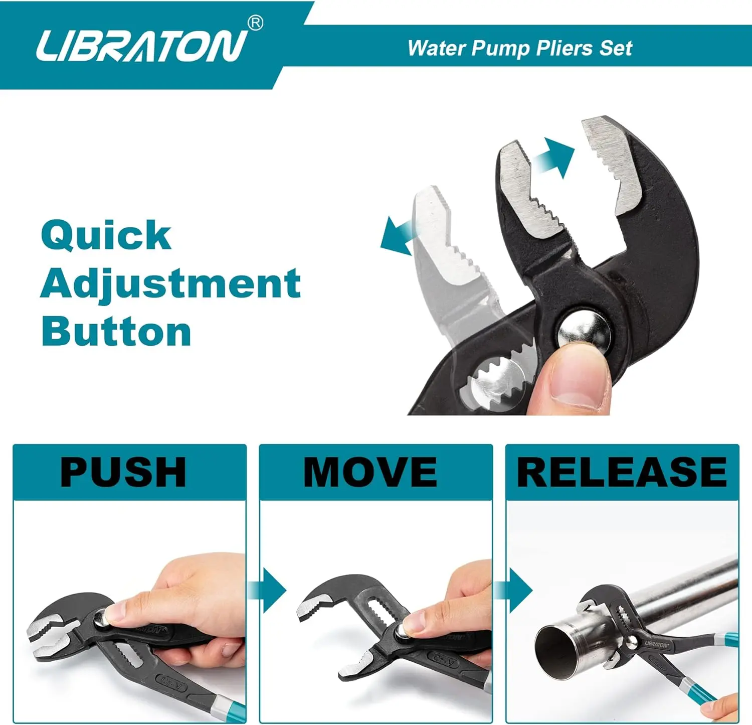 ·【Slip-joint Design】Libraton water pump plier can be adjusted quickly and precisely with its ratcheting push-button adjustment mechanism. So it is easy to change the width of the jaw to accommodate different sized nuts or bolts.