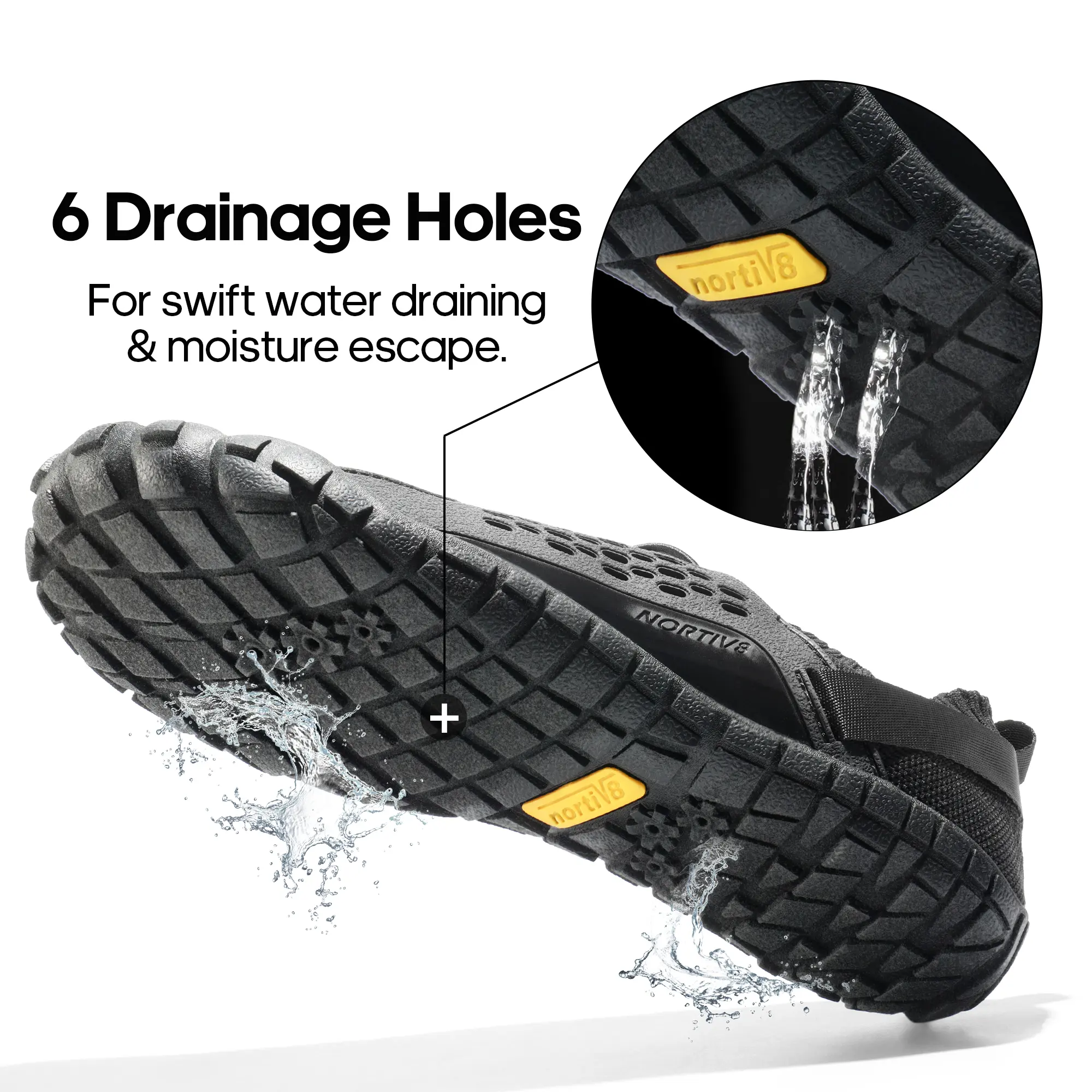 ·Quick Drying: Quick water drainage is made possible by the outsole's drainage holes & a knitted fabric upper.
