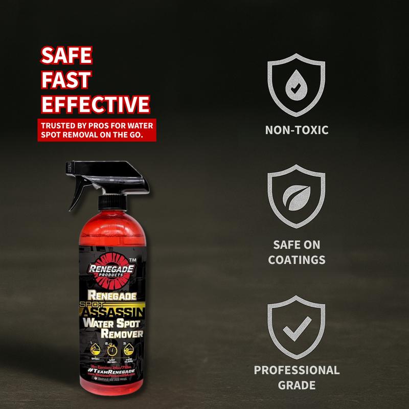 Renegade Spot Assassin is a powerful, non-toxic, and non-abrasive water spot remover that works fast to dissolve mineral stains, water spots, and alkaline buildup. Whether you're dealing with post-rain streaks, sprinkler overspray, or hard water residue, this product neutralizes and removes tough deposits from paint, glass, wheels, and polished metals in seconds.