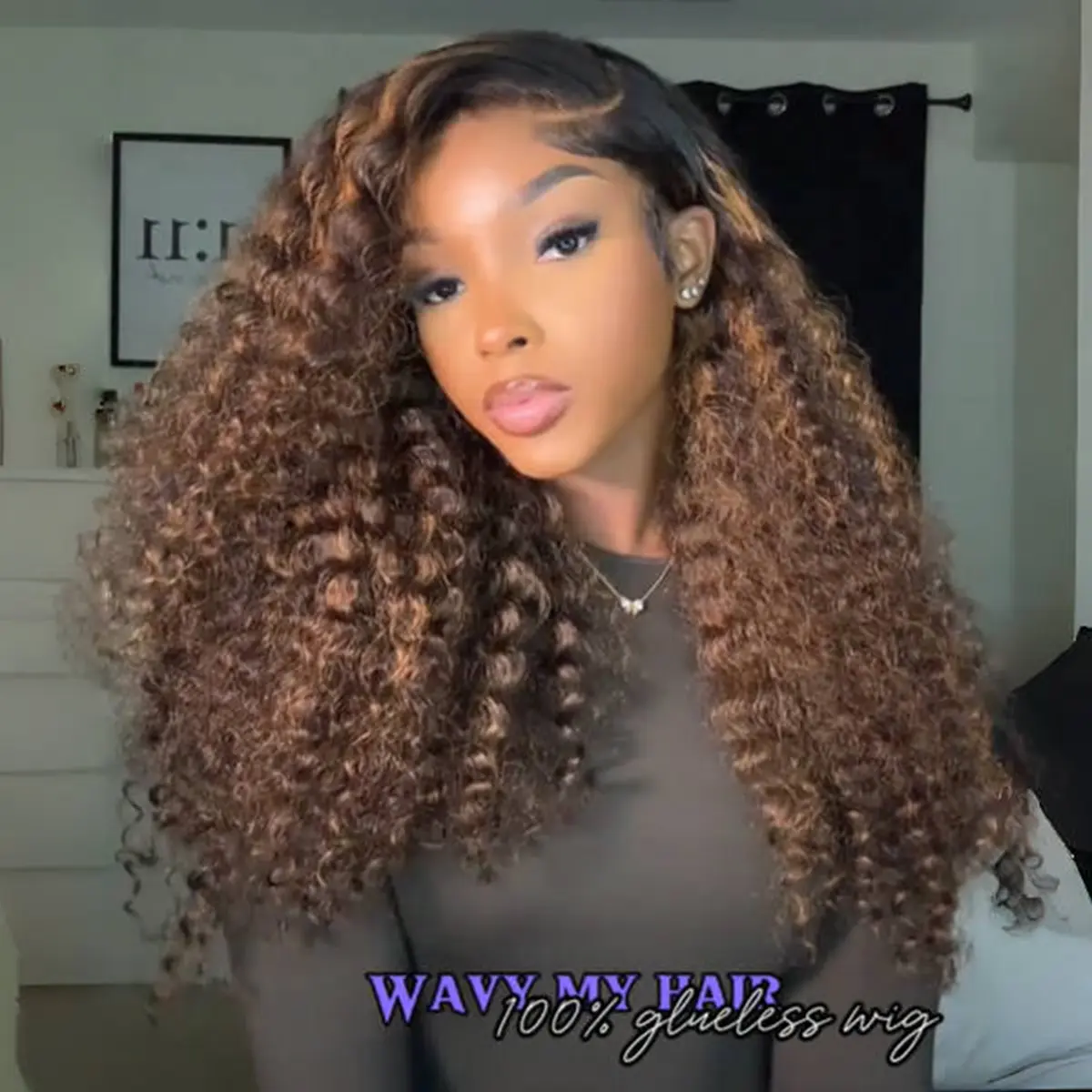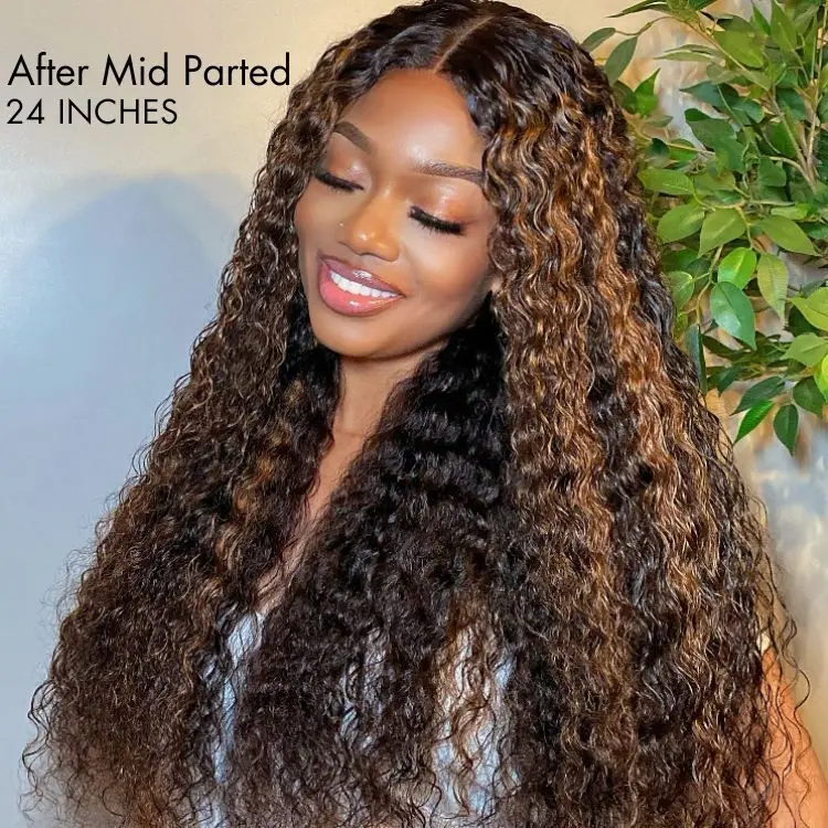Enhance your look effortlessly with the Wavymy Wear Go Minimalist Brown Highlights Water Wave Glueless Lace Front Wig. Perfect for beginners, this long curly wig offers a natural and stylish appearance.