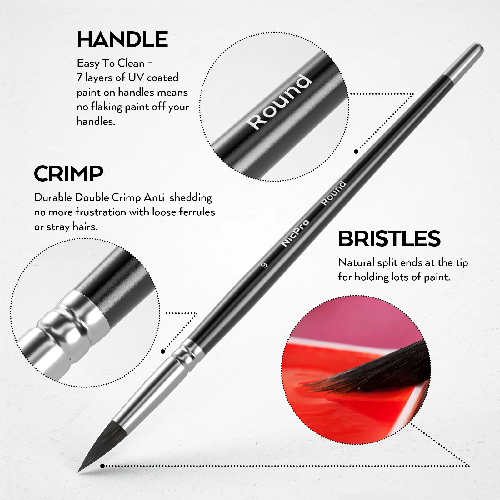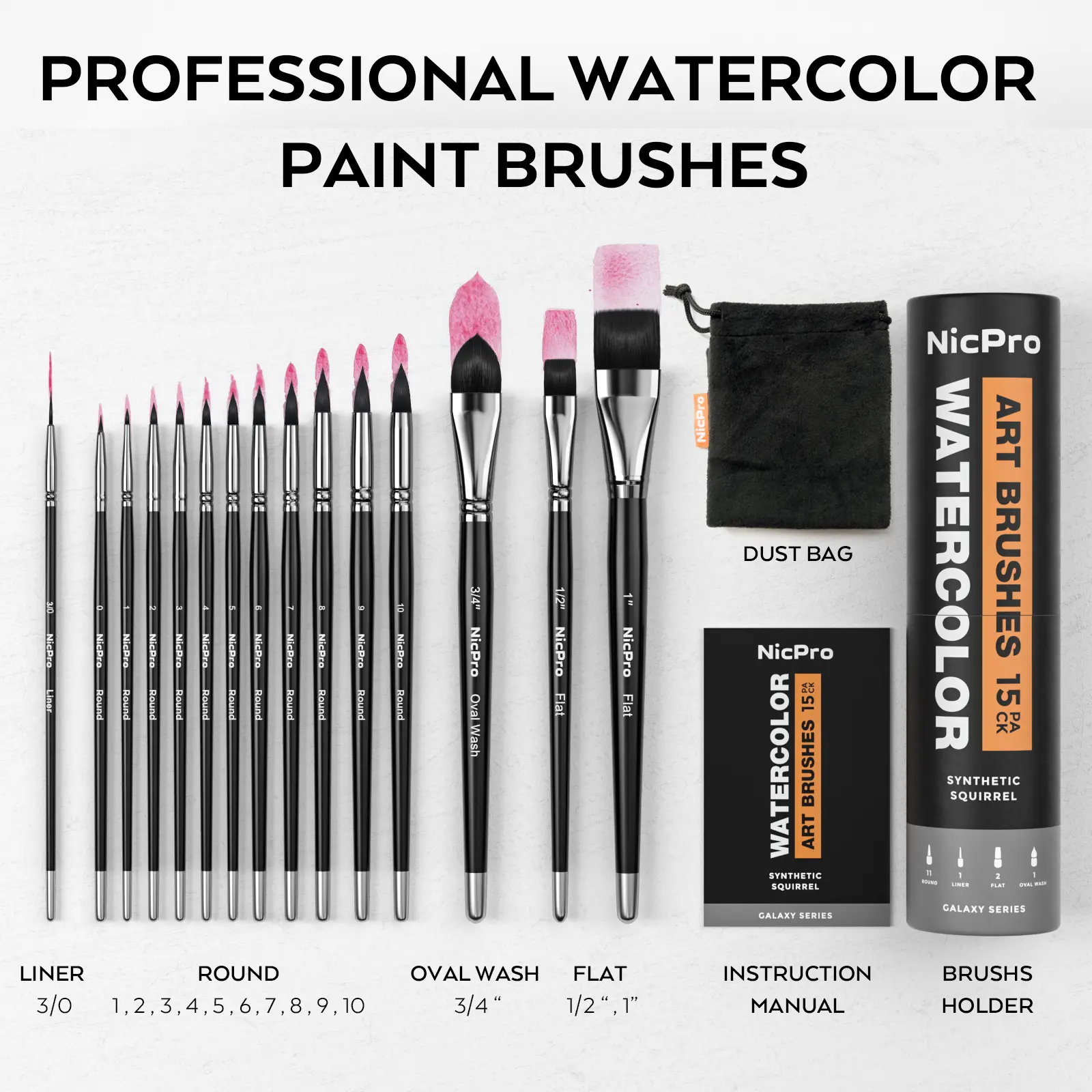 ·Various round sizes - The set of brushes include 15 Pack of different sizes with round pointed tips Round 1,2,3,4,5,6,7,8,9,10. Liner 3/0. Flat 1/2 “ Flat 1” and oval wash 3/4 “