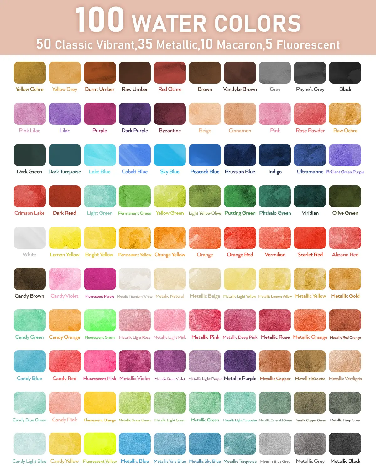 ·100 Colors Watercolor Paint Set: Includes 50 classic watercolors, 35 metallic colors, 10 macaron colors, and 5 fluorescent colors.