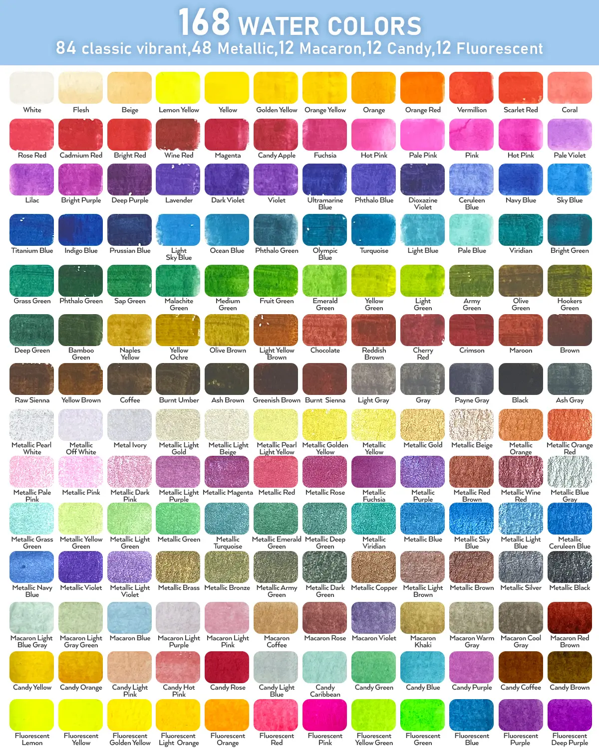 ·168 Vivid Colors: This Nicpro Watercolor set including 84 classic watercolors,48 metallic colors,12 macaron colors, 12 candies colors and 12 fluorescent colors,offer many color options to save you time from having to blend custom colors. With 168 different watercolor paints to choose from, free your imagination.