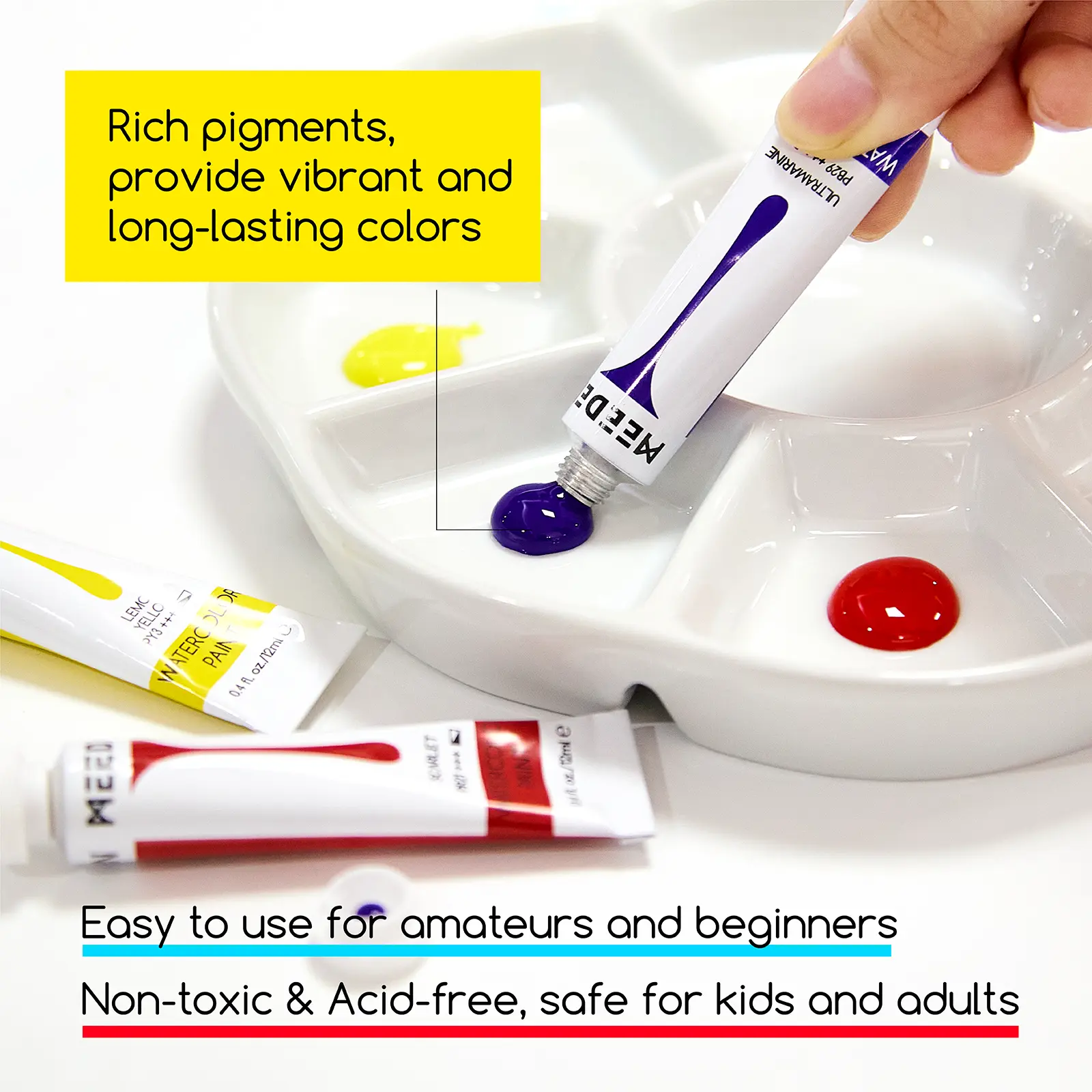 ·NON-TOXIC STATEMENT: MEEDEN watercolors are certified to AP, CE, and ASTM D-4236 standards and comply with solvent-acid-free, harmless elements, and 100% environmental principles. From art watchers to seasoned artists and toddlers to the elderly, the set will suit them just fine.