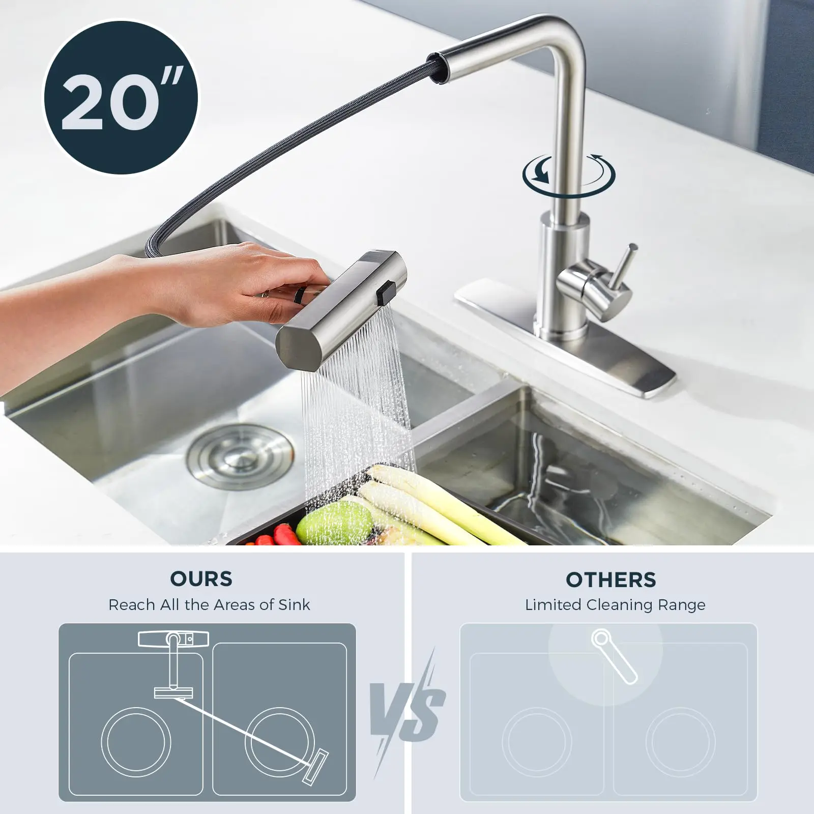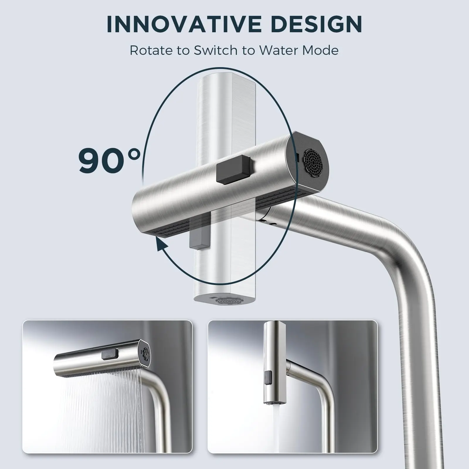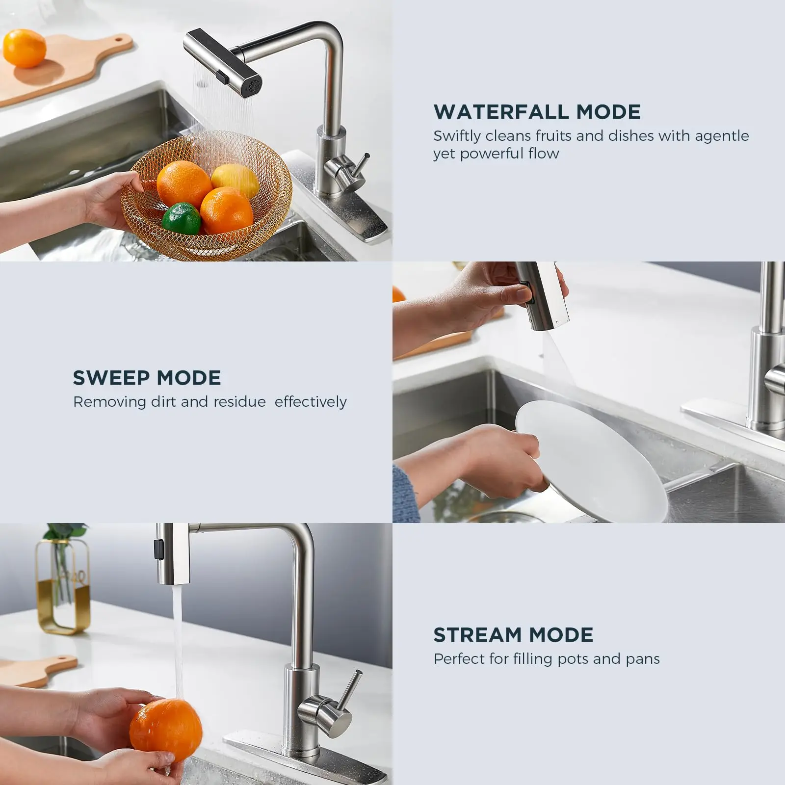 ·New Function Mode: FORIOUS kitchen faucets has been upgraded to three function mode, Waterfall, Sweep, and Stream. Stream for filling containers without sputtering, Sweep for efficient dish washin, and Waterfall for cleaning large areas delicately. 90° rotating flexibly switches between waterfall and water flow modes.