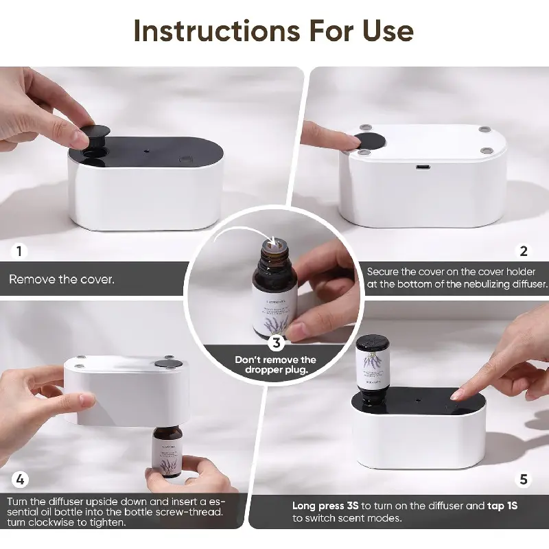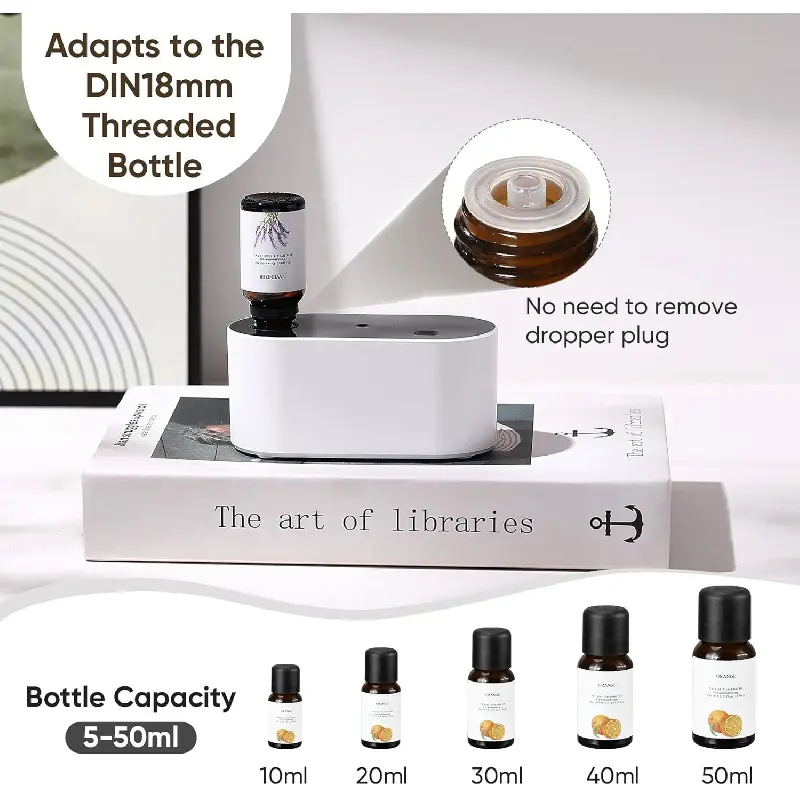 [No Need To Remove The Dropper Plug]Our battery operated diffuser features an innovative dropper plug design compatible with DIN18mm threaded bottles, allowing you to effortlessly use it without removing the dropper caps.Compatible with essential oil bottles from 5ml to 50ml and various pure essential oils on the market, this rechargeable nebulizing diffuser delivers unprecedented freedom and convenience in your aromatherapy experience.