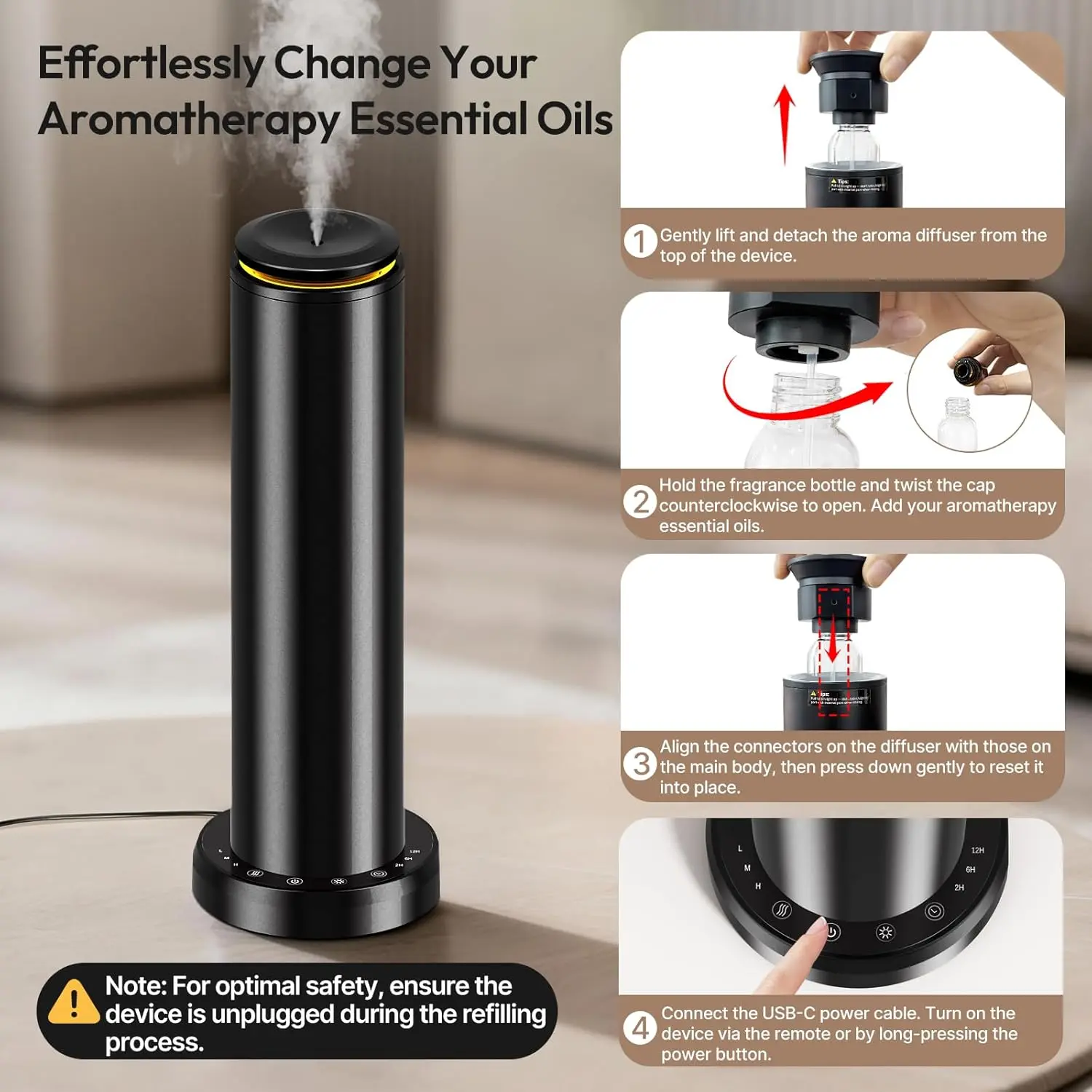 [Advanced Waterless Diffusion Technology]This scent diffuser utilizes cold-air diffusion technology to convert pure essential oils into a cleaner mist-no water or heat needed.It preserves the natural scent profile of your oils and delivers a long-lasting fragrance experience without residue, making it safe for homes with pets, children, and delicate furniture[Wide & Adjustable Fragrance Coverage]Engineered for large room coverage 2000 sq.ft, this waterless diffuser is ideal for living rooms, bedrooms, hotel lobbies, and offices, easily creating a five-star hotel-like atmosphere.With multiple intensity levels (L1–L3), you can customize the fragrance strength to match your mood and space size[Remote Control & Silent Technology]Control your aromatherapy experience effortlessly with the included remote.Adjust mist intensity, set timers, and switch modes without leaving your seat.The whisper-quiet operation ensures a peaceful environment for work, sleep, making it ideal for creating a soothing ambiance in any setting[Elegant design & Mood Lighting]Featuring a modern tower-style design in premium aluminum alloy, this sentiment diffuser also includes a soft, energy-efficient LED night light.The light to create a calming visual atmosphere that complements your scent journey.The hotel diffuser seamlessly fits into any decor,providing a touch of elegance and luxury wherever you need it[Scent diffuser starter kit]This aromatherapy diffuser kit includes the diffuser unit, one 110ml refillable essential oil bottle, five trial-size essential oils, remote control(The remote control comes with one CR2025 lithium metal battery - only one battery is included per remote control. ), USB cable, power adapter,sealing ring, replaceable atomizer core*2 and a user manual,along with support & 3 years warranty.Usage Note: Please use the included adapter and cable to power the diffuser