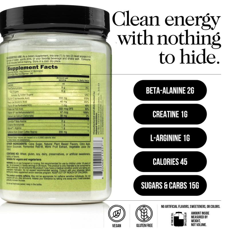 IngredientsVitamin C,Vitamin B3,Vitamin B6,Vitamin B12,Folate,Calcium,Beta Alanine,Creatine Monohydrate,L-Arginine,Caffeine (from 100% organic coffee beans),Cane Sugar,Natural Plant-Based Flavors,Citric Acid,Sodium Gluconate,Fermented Reb-M,Monk Fruit Extract,Vegetable Juice (for Color)