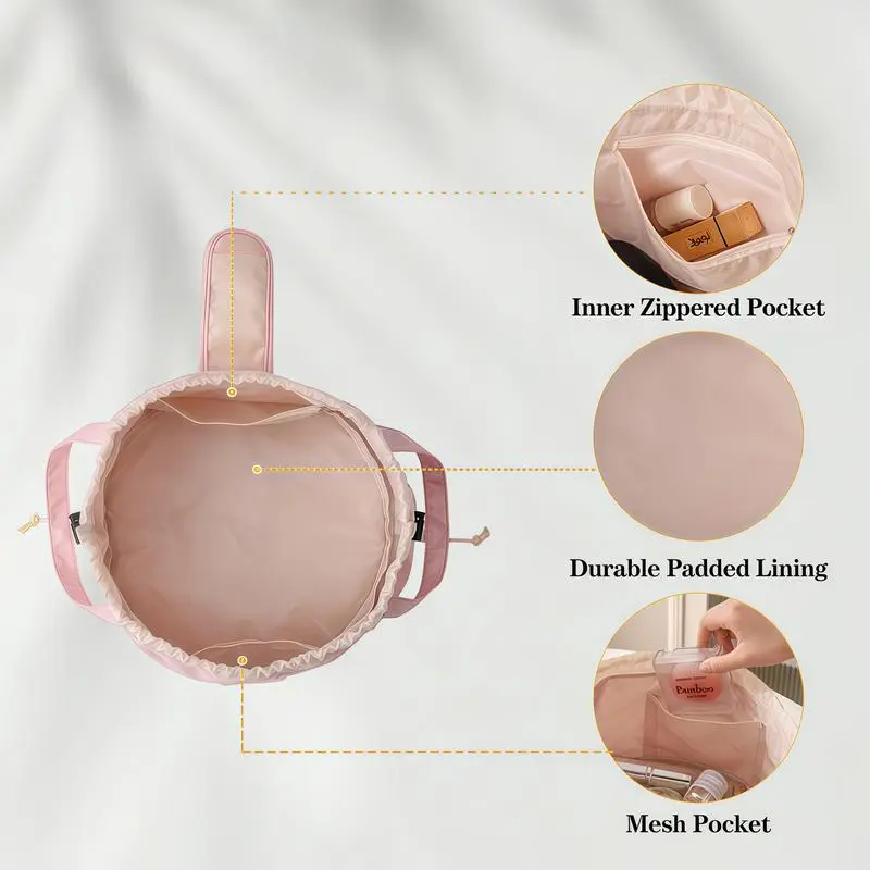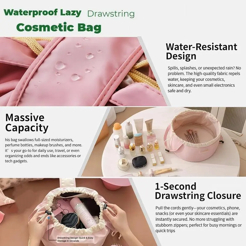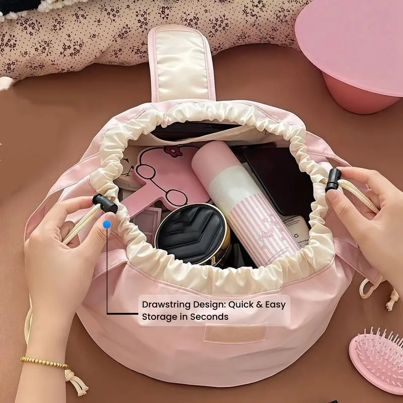 1.Waterproof Drawstring Makeup Bag Effortless Organization·Tired of messy makeup bags? Our Lazy Drawstring Cosmetic Bag transforms from a spacious storage hub to a neatly organized pouch. One pull closes, one open accesses all your cosmetics, skincare, and brushes. No more digging around!
