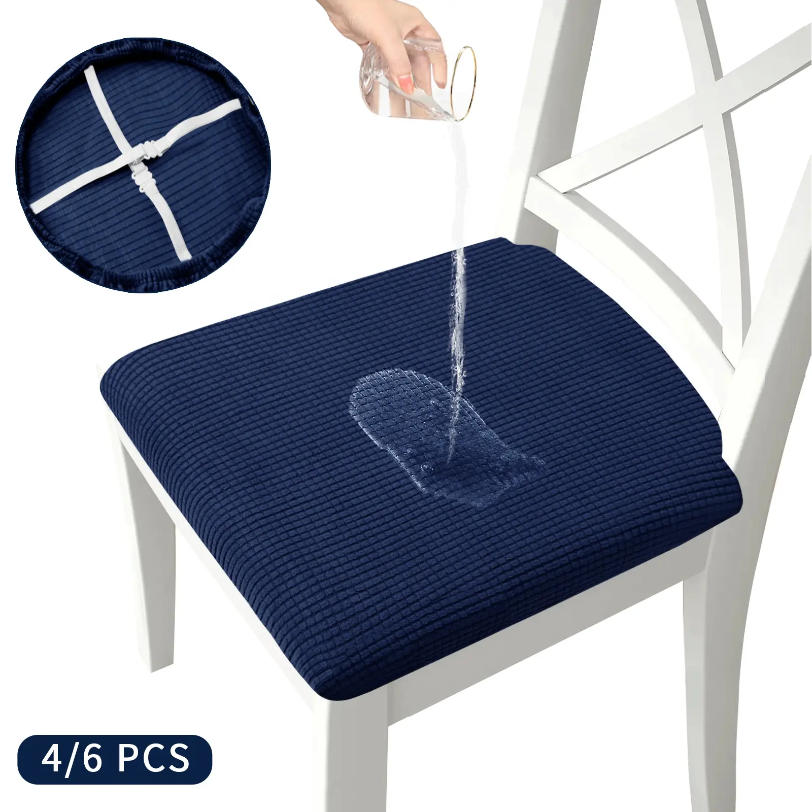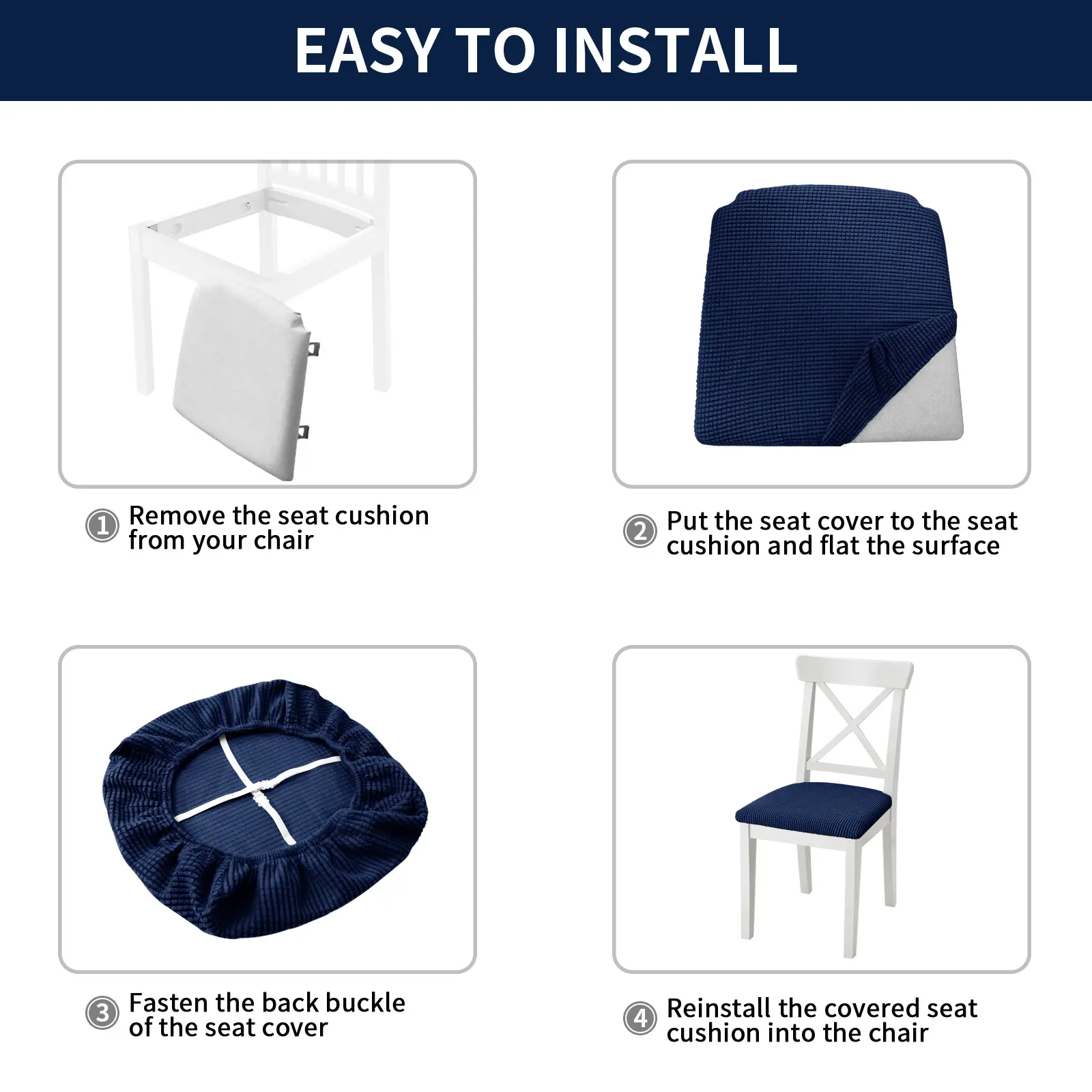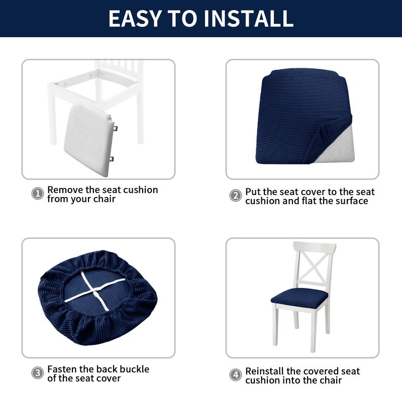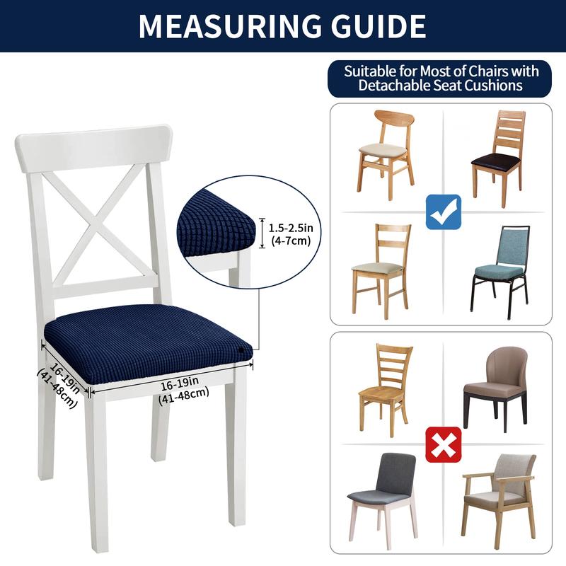 Pay attention to the Size: There are 4/6 counts in a set of dining chair seat covers. These chair covers are suitable for seat cushions that are 16"-19" long, 16"-19" wide, and 1.5"-2.5" thick. Please refer to the measurement guide provided in the product images to ensure a perfect fit for your chair.