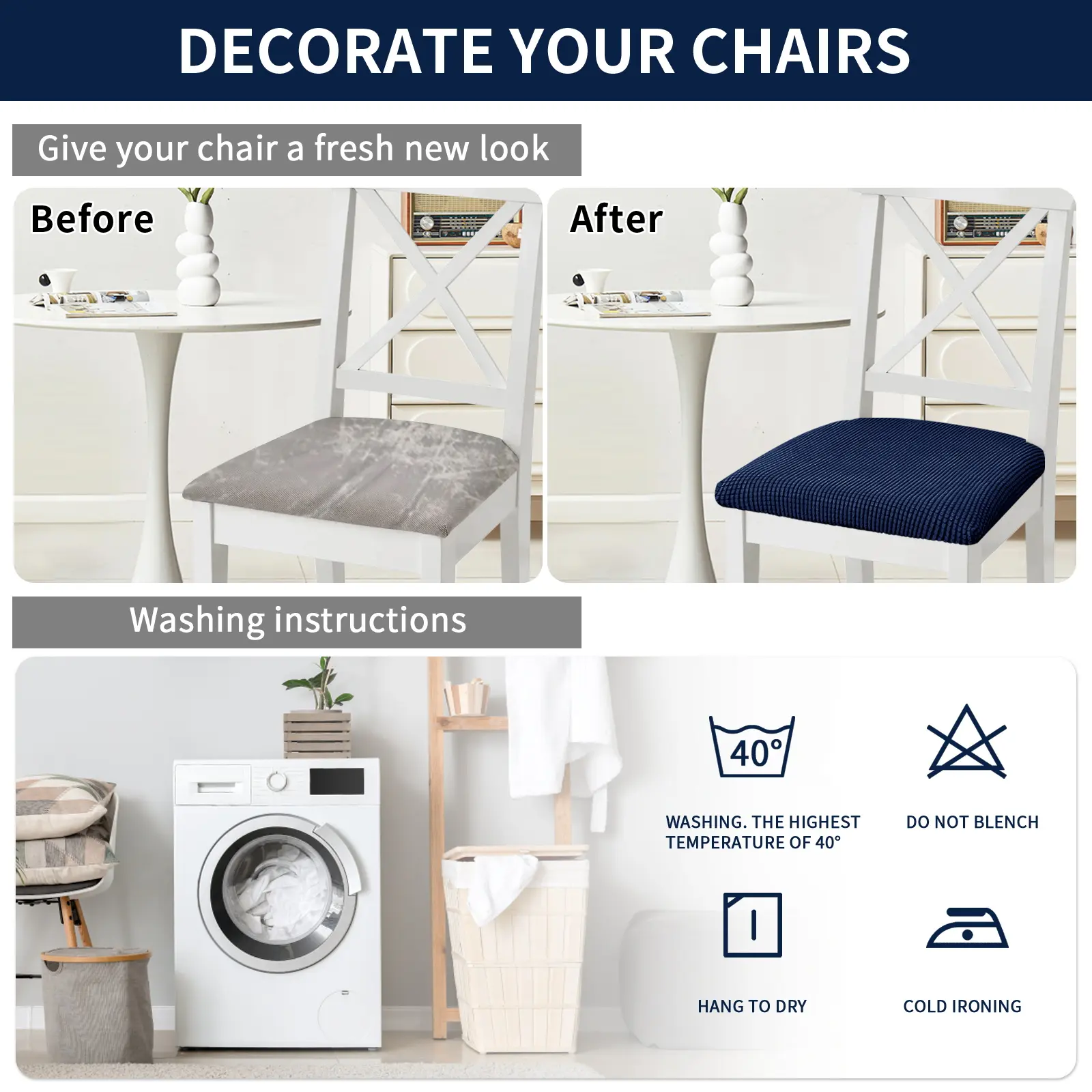 Versatile and easy to care for: These chair covers can be used in family dining room, office, kitchen, banquet, ceremony, party. Not recommended for foldable chairs, machine wash alone in cold water, no bleach, tumble dry low, no ironing.