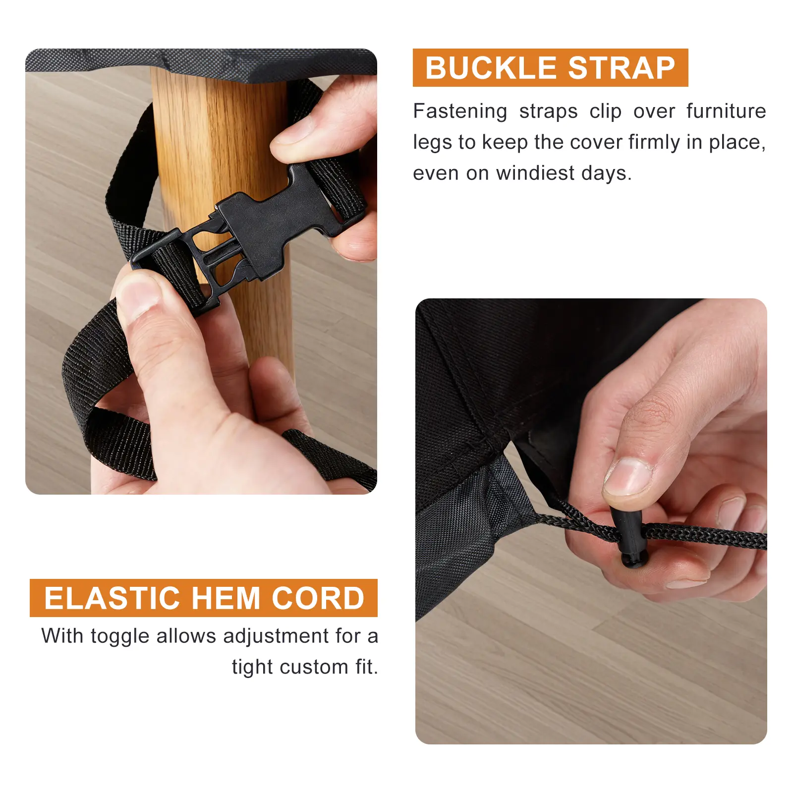 ·Plastic clips & heavy-duty elastic draw cords secured to table leg, especially during high winds and severe weather.