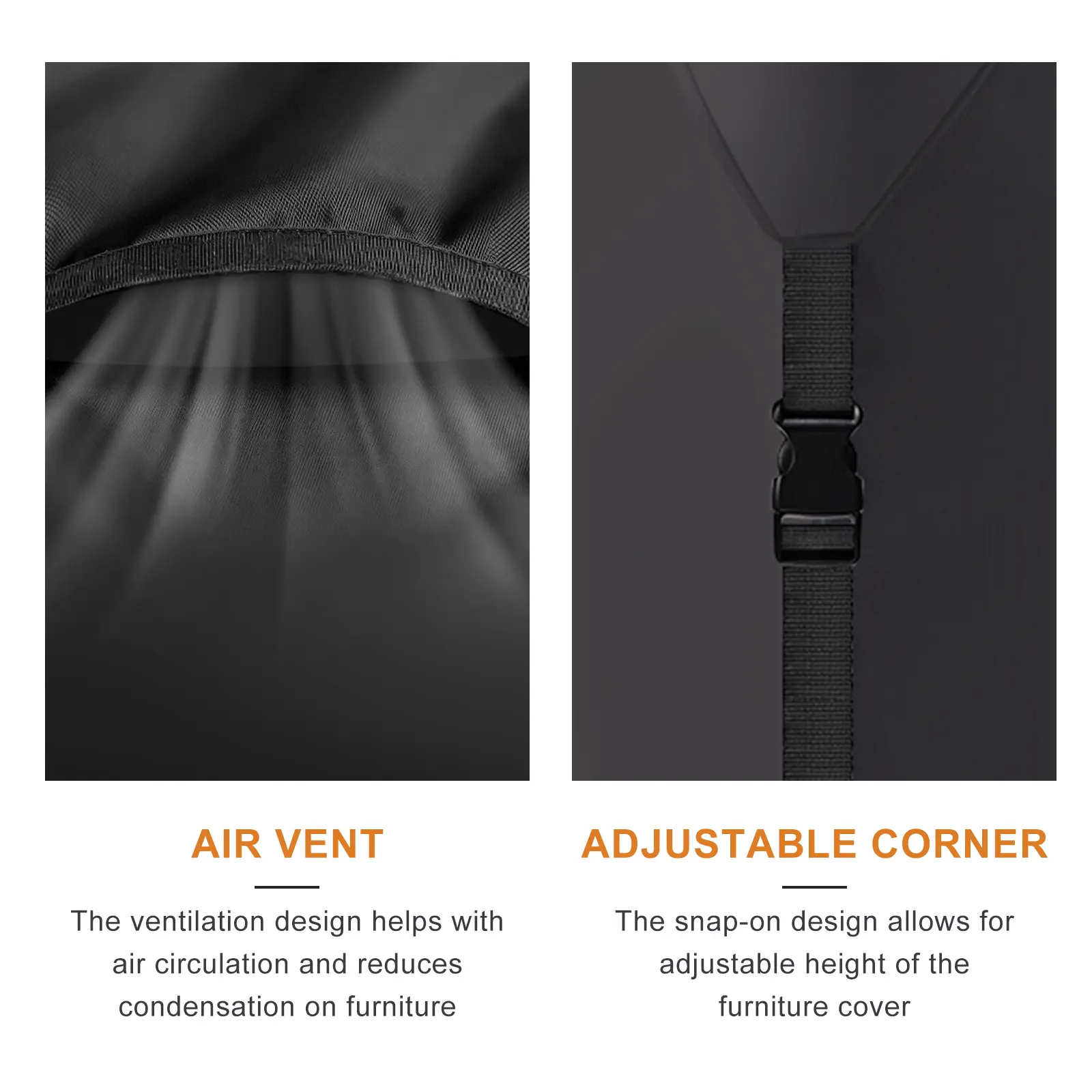 ·Well-made structured air vents at two sides keep ventilation, prevent the cover from being blown away, also keep your furniture dry and in good condition.