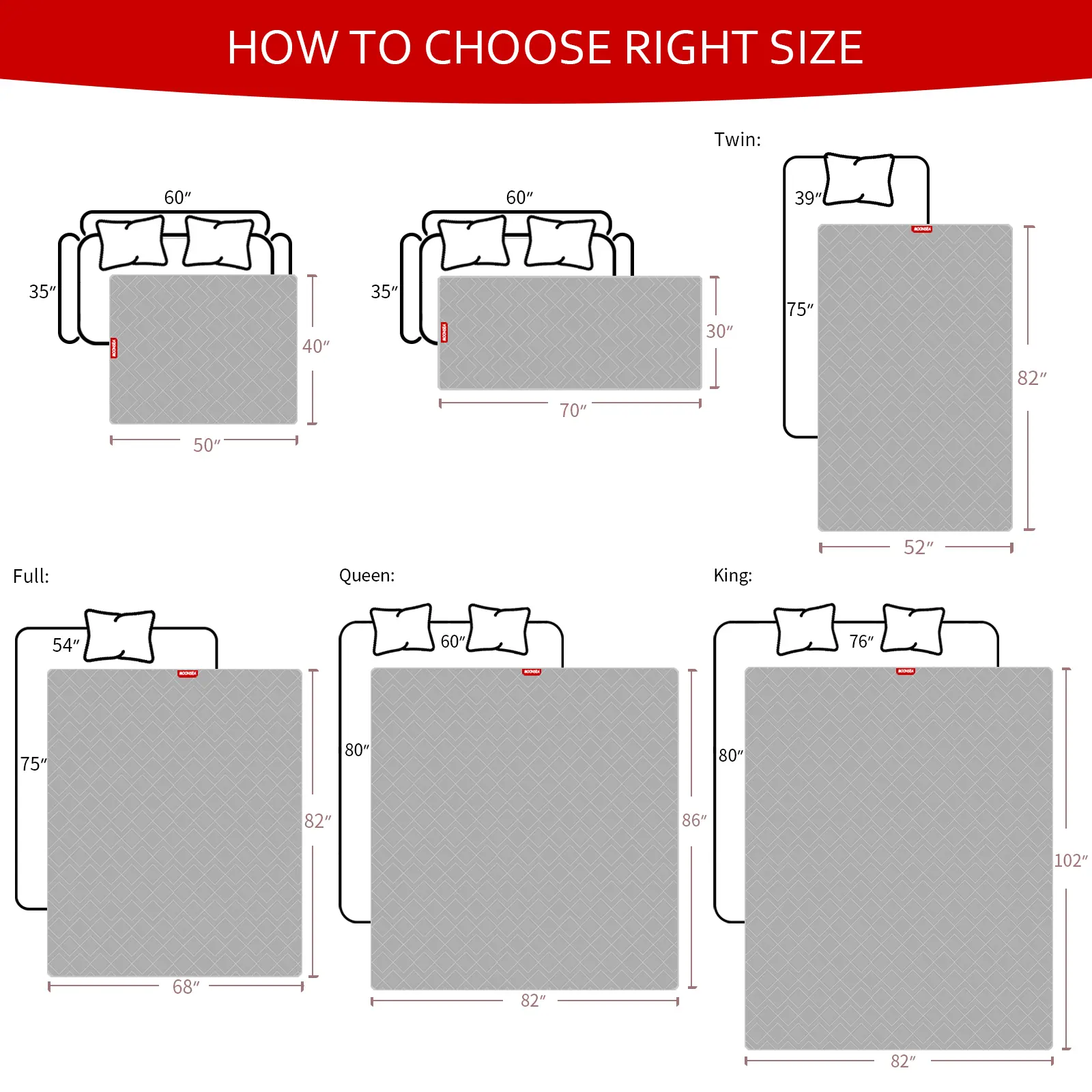 ·Suitable Sizes: Fit Standard Bed and Sofa. Available in various sizes: 30'' x 70''(sofa size), 40'' x 50''(sofa size), 52'' x 82''(twin size), 68'' x 82''(full size), 86'' x 82''(queen size), 102'' x 82''(king size). Choose the right size for your pet.