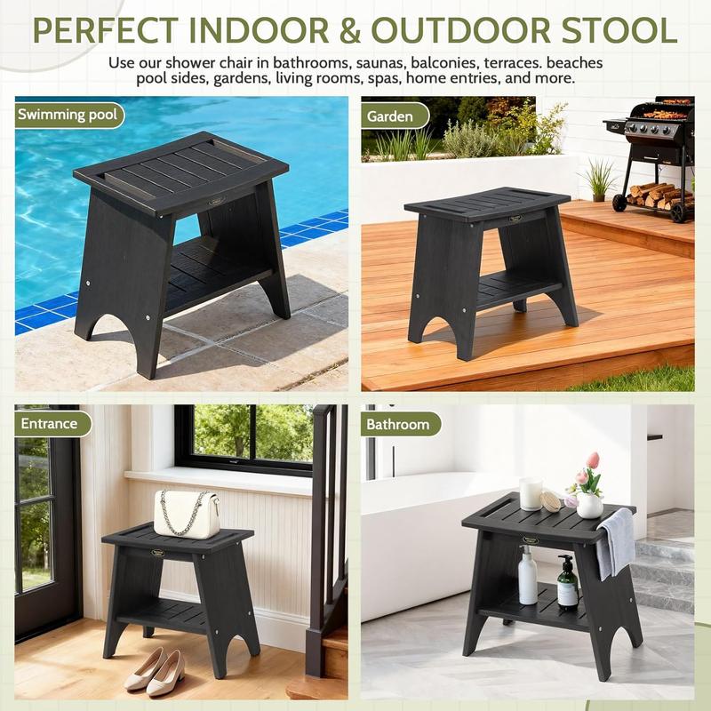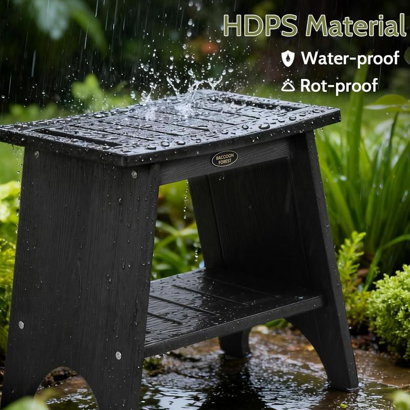 HdpsHDPS Durable Material: Expertly crafted from high-density HDPS, the shower chairs boasts a look and feel remarkably similar to real wood with natural, attractive grain patterns.The HDPS material enhances the shower seats's waterproofing waterproofing, moisture resistance, scratch resistance, stain resistance, and UV protection.The unique HDPS material makes this shower shelf ideal for humid bathrooms and outdoor settings, resisting cracking and warping even with prolonged use.For those who value both aesthetic appeal and lasting quality, HDPS shower bench seat are the intelligent choiceHeavy Duty Shower Storage:This bath seat is built with a reinforced triangular support frame, thickened legs, and non-slip pads..This design enables the shower seats for adults to offering a weight capacity of up to 500 lbs.The bathroom shelf’s scientifically engineered structure distributes frce evenly, ensuring exceptional stability without wobbling-even under prolonged use or user movement.Compared to plastic shower chairs, the shower chair for inside shower delivers a more solid feel and significantly greater durability.The shower foot rest is a master bathroom essentials addition to any bathroom for safe, comfortable bathing and daily careNon-Slip Bath Stool: Each chair for shower is equipped with four high-performance rubber anti-slip pads.These pads provide a strong grip, ensuring the shower stools remains securely in place on slippery tile surfaces, wooden floors, and more.This effectively prevents accidental slipping while protecting your flooring from scratches.The bathroom stool features a gently curved design that contours to the hips, offering comfortable seating and promoting rapid water drainage.Even with prolonged use, water will not pool or cause discomfort, providing stable, custom-like support for your shower experienceStorage Shower Shelves: This small shower chair is much more than a typical bathroom seat.The bath bench's 2-tier storage rack design keeps shampoo, body wash, bathrobes, razors, and other bathing essentials within easy reach.The openwork sides provide convenient space for hanging towels and shower head.This shower storage for inside shower allows you to sit while showering anytime and anywhere-especially useful for leg care or body cleansing.These chair with storage thoughtful features greatly reduce the need to stand, turn, or bend during bathing, making bathroom time safer, easier, and more organizedMultifunctional Bath Chair: This small shower stool features a classic, elegant design and sturdy, durable construction, allowing it to seamlessly blend into any home environment.In the bathroom, stool chair can be used as a seat for shower or a shower rack.On the balcony or in the garden, small stool serves as a plant stand or a leisure stool.In the entryway, stool for shower functions as a shoe bench.In the living room or bedroom, bathroom table works as a side table, bedside commode, or storage stool.Suitable for both indoor and outdoor use, shower benches offers versatile functionality and efficient space utilizationEasy-Clean Bathroom Bench: Crafted from special HDPS material, this bathroom seat requires no painting or sanding, unlike traditional wooden stool, bamboo bench, or teak shower bench.Simply wipe bath table down for daily maintenance-shower stool for shaving legs will never rot or rust.The bench for shower features waterproof construction with a surface that resists water pooling.The bathroom stools’s hollow or grid design allows for quick drainage, keeping it dryVersatile Uses: This bathroom bench seat design thoughtfully addresses the specific needs of various groups.For seniors and individuals with limited mobility, this shower seats for seniors provides a safe shower seat that reduces the risk of slipping.For those recovering from surgery or pregnant users, stool bathroom alleviates the strain of standing, making bathing more comfortable.For everyday households, waterproof shower bench serves as a practical tool that enhances bathing comfort, assists in bathing children, and aids in leg care.This shower shelf for inside shower is a considerate gift that promotes your family's health and safetyQuick Installation: Each bath chairs for showers package includes drain base plates*2, curved side supports*2, 8 stainless steel screws*8, wrench*1, and installation manual*1.With all components clearly included and a detailed illustrated manual provided, chairs for in the shower installation is hassle-free.Whether installing alone or with family, you will encounter no difficulties.This convenience allows you to immediately enjoy the comfort and ease the product provides-no waiting required.Start your more relaxed and safer bathing experience right awayPremium Service: We provide premium service for the quality of bathtub bench, backed by a professional team to handle all issues.For any questions regarding our stools, we will provide a suitable solution within 24 hours
