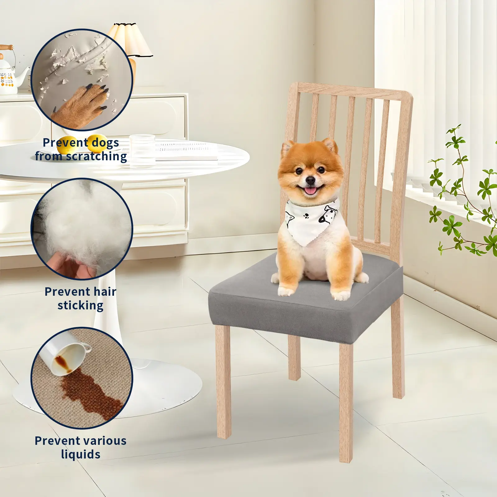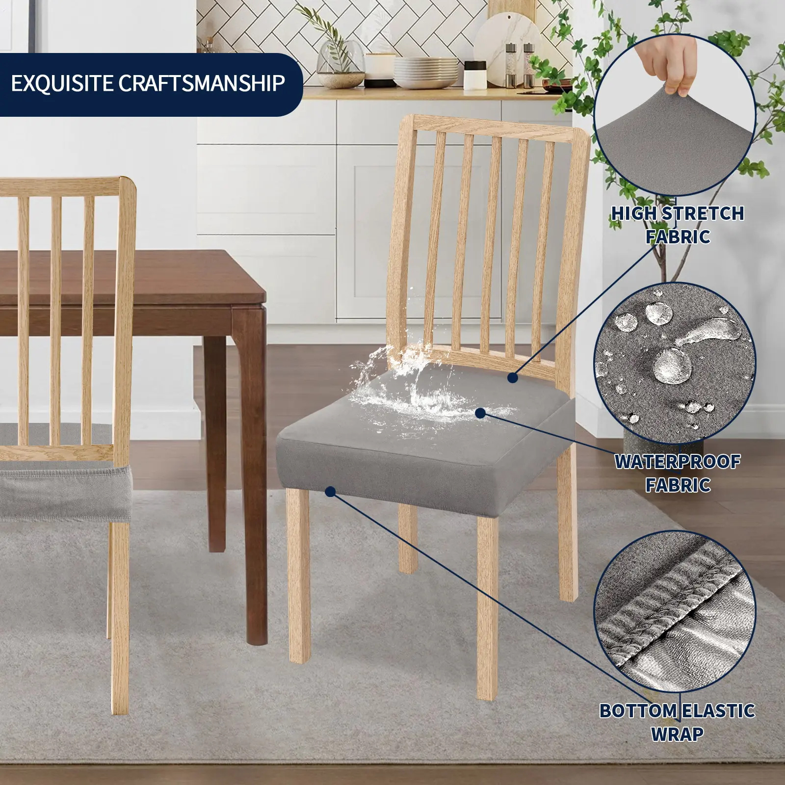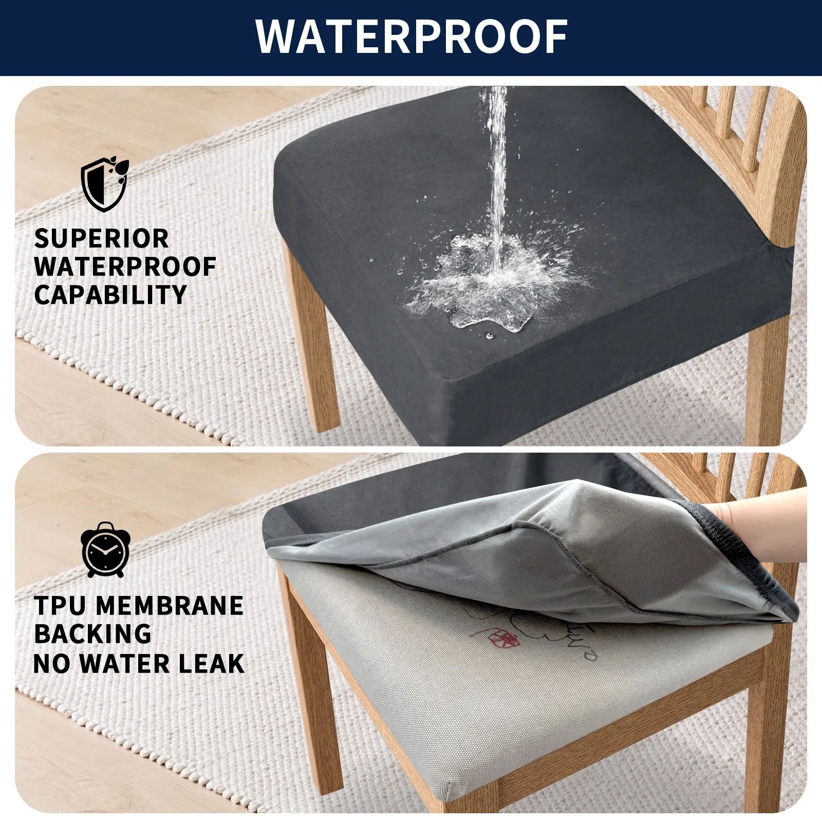 The seat covers for dining chair are processed with water resistant treatment and TPU membrane backing. Dual waterproof feature can resist liquid spills and prevent leakage, to better protect your favorite furniture.