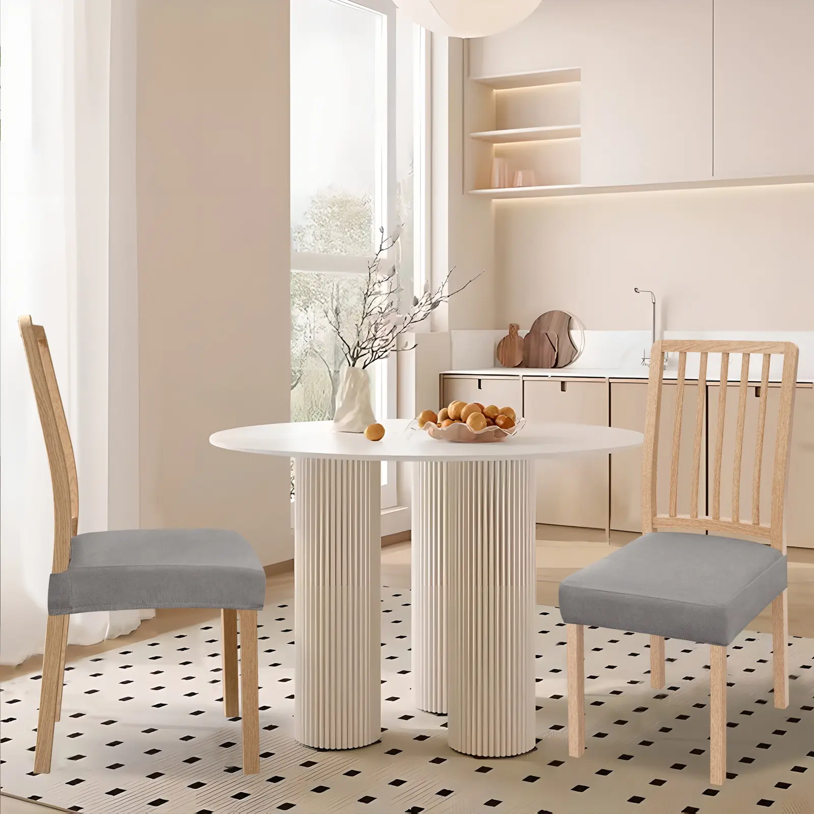 The chair seat covers are great for upholstered chairs in kitchen and dining room. They will not only safeguard your dining chairs from stains, dirt and pet damages, but also transform your chair to new look.