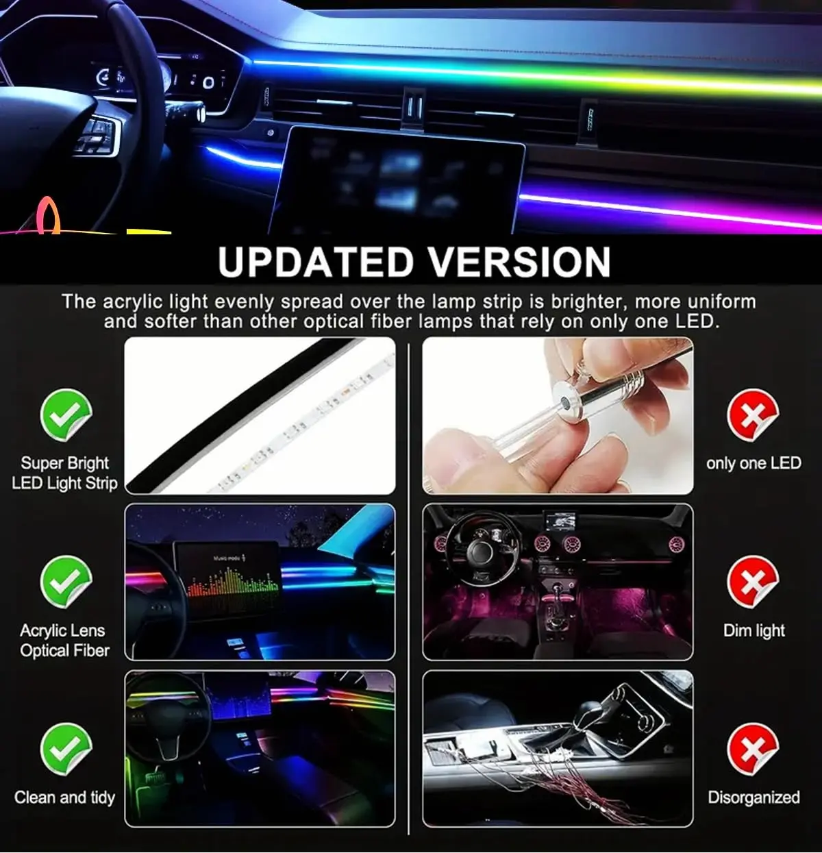 ✨ 43.3 Inches of Dreamcolor LED: This kit features an ultrathin acrylic strip, measuring 43.3 inches. Perfect for center console and dashboard lighting, it enhances your vehicle's ambiance effortlessly. Upgrade your car's interior with this sleek, modern solution.