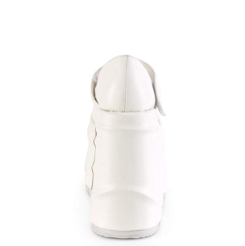 Introducing the Wave-32, a bold reinterpretation of the timeless Maryjane. This shoe stands tall on a 6" wedge platform, crafted entirely from white vegan leather for a look that's both striking and sustainable. The hook & loop strap adds contemporary flair. Perfect for those who love to express themselves through their footwear, the Wave-32 is a must-have for the fashion-forward individual.