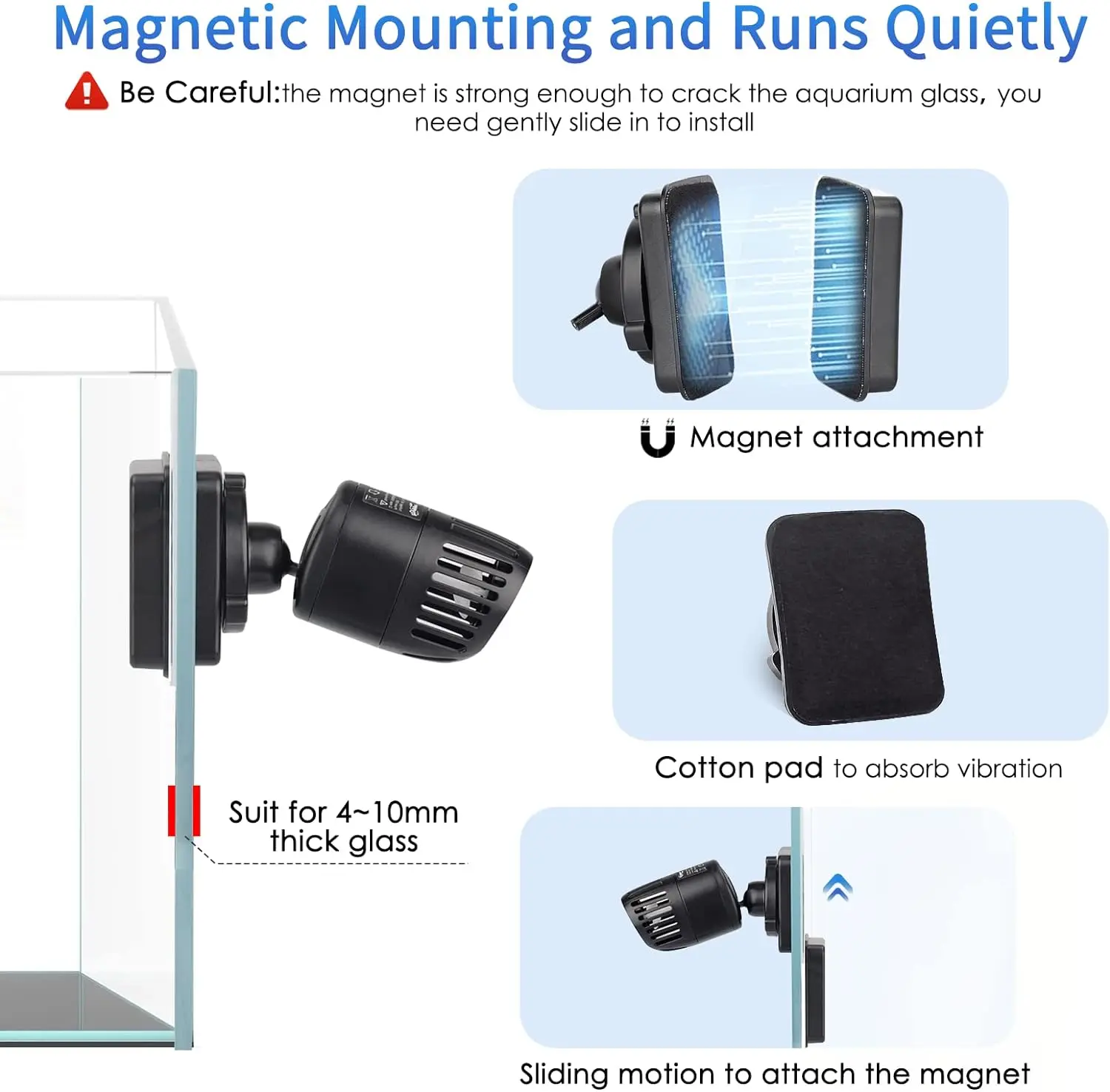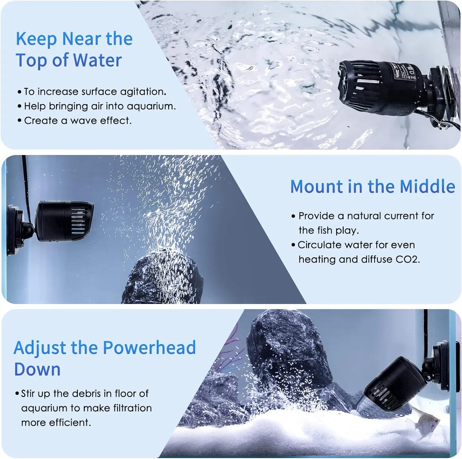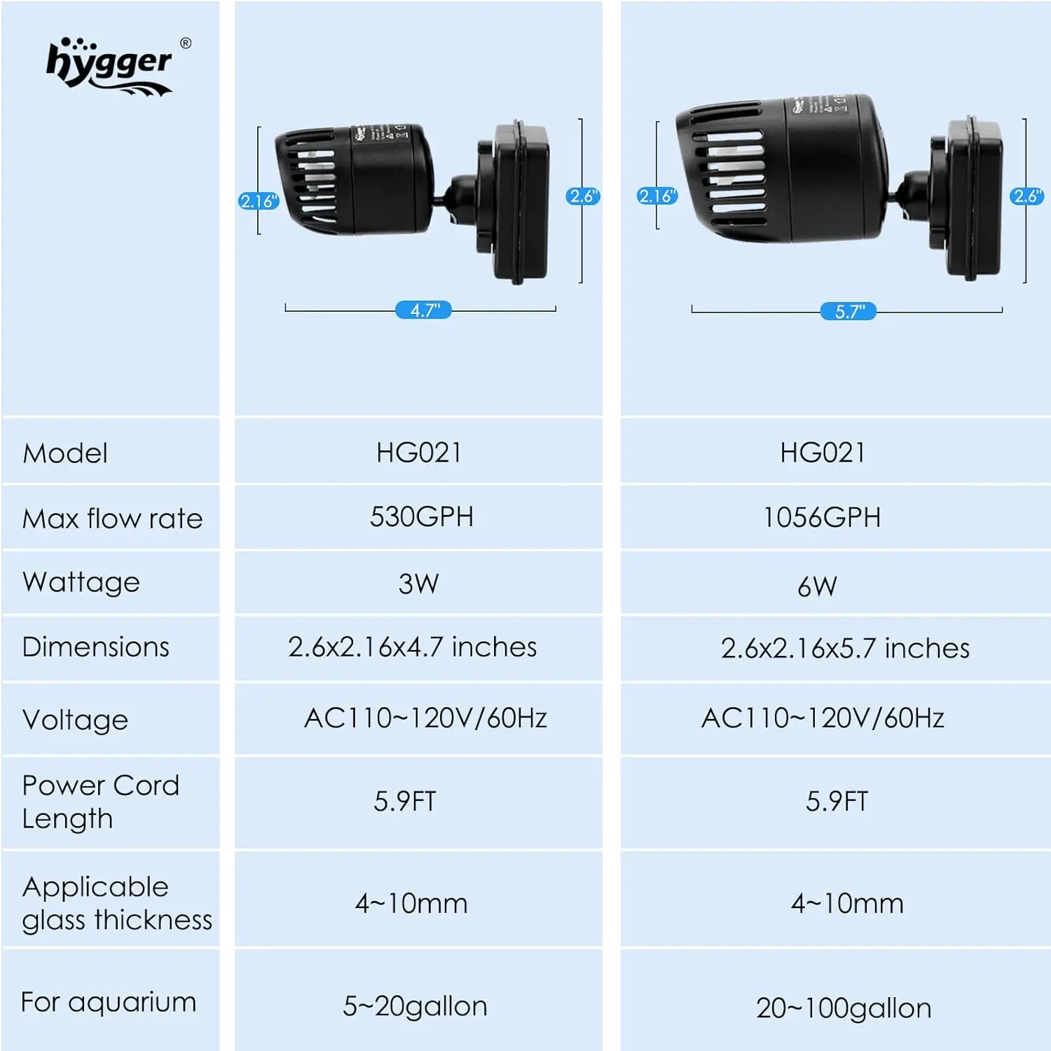 This 12w pump was better than expected. The pump will run 40-100% 528-1321 GPH. I would recommend this pump for a 20 gallon or larger fish tank. This pump is also great for mixing water in a 5 gallon bucket.