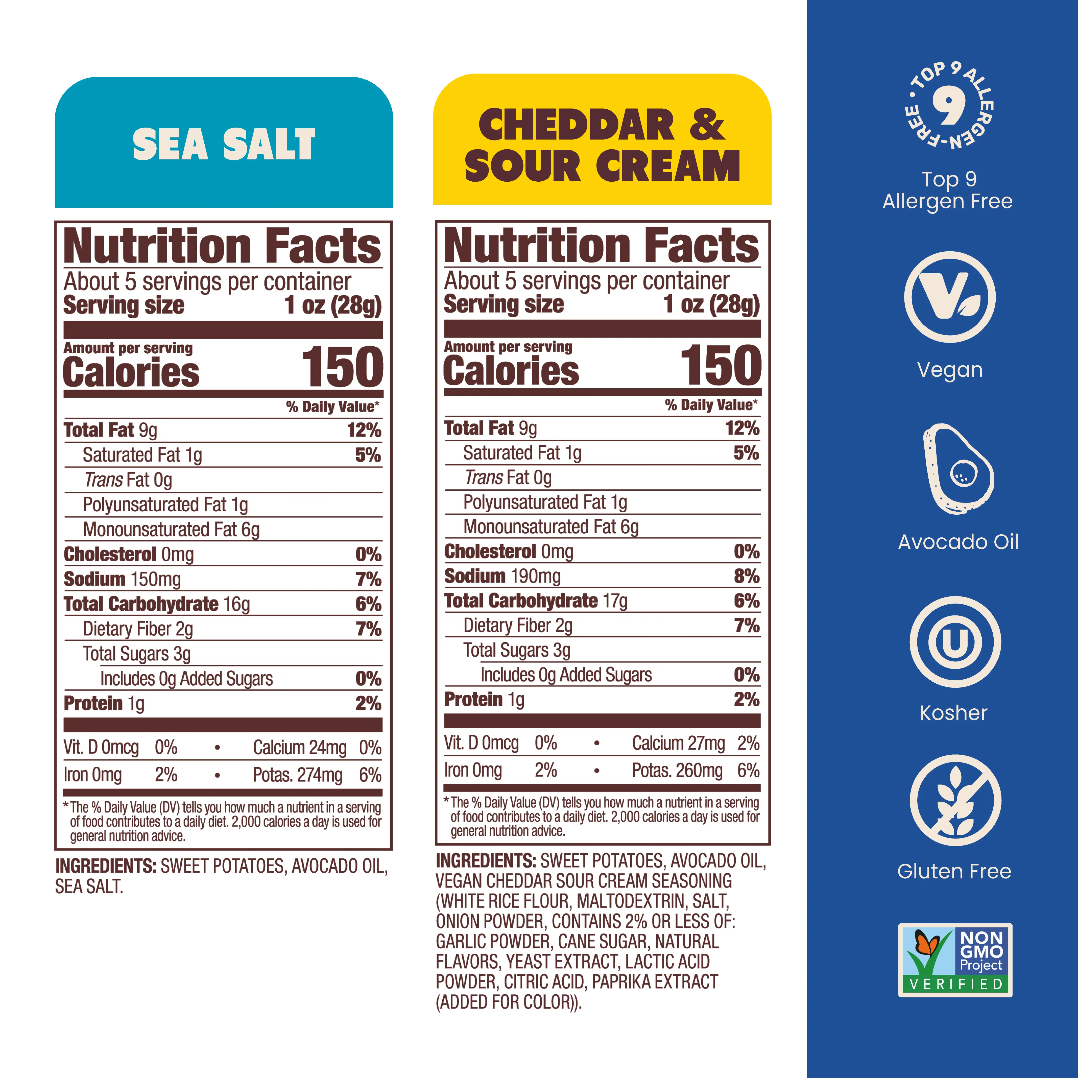 Cheddar & Sour Cream: Sweet potatoes, avocado oil, vegan Cheddar Sour Cream Seasoning (white rice flour, maltodextrin, salt, onion powder, contains 2% or less of: garlic powder, cane sugar, natural flavors, yeast extract, lactic acid powder, citric acid, paprika extract (added for color))