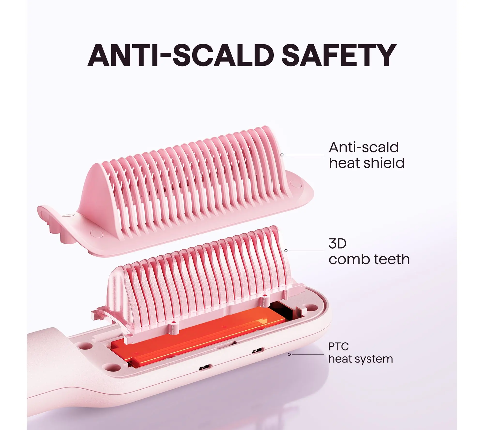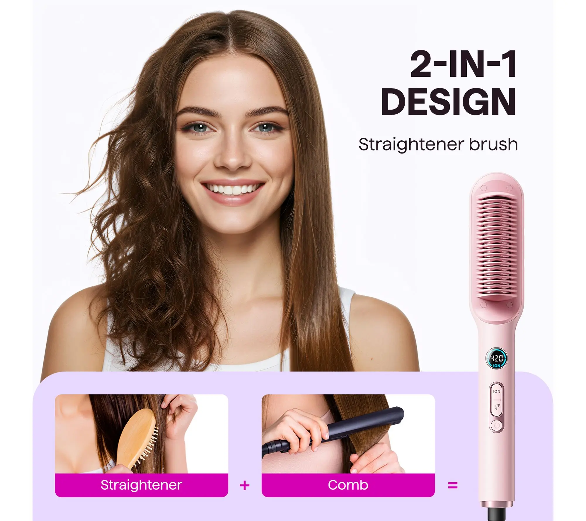 Fight frizz, static, and add shine with the Sleek Sweep ionic straightener brush. Comb and flat iron all in one, ideal for hair shoulder-length to 30" long. Six heat settings and 3D teeth for smooth, customized straightening.