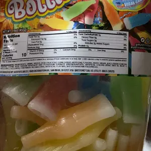 ·Ingredients: Corn Syrup, Sugar, Water, Gelatine, Dextrose; Humectant: Glycerol; Acids: Citric Acid, Malic Acid; Invert Sugar Syrup; Gelling Agent: Pectins; Acidity Regulator: Sodium Malates, Sodium Citrates; Natural and Artificial Flavor, Color: Yellow 5, Blue 1.