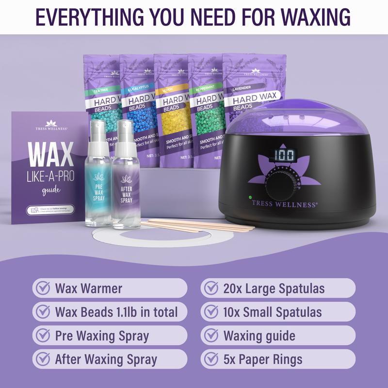 ·Everything you need in one kit: Our complete waxing kit includes a digital wax warmer, 5 scented wax bean bags, pre- and post-wax care sprays, waxing sticks, and our exclusive "Wax Like a Pro" guide.