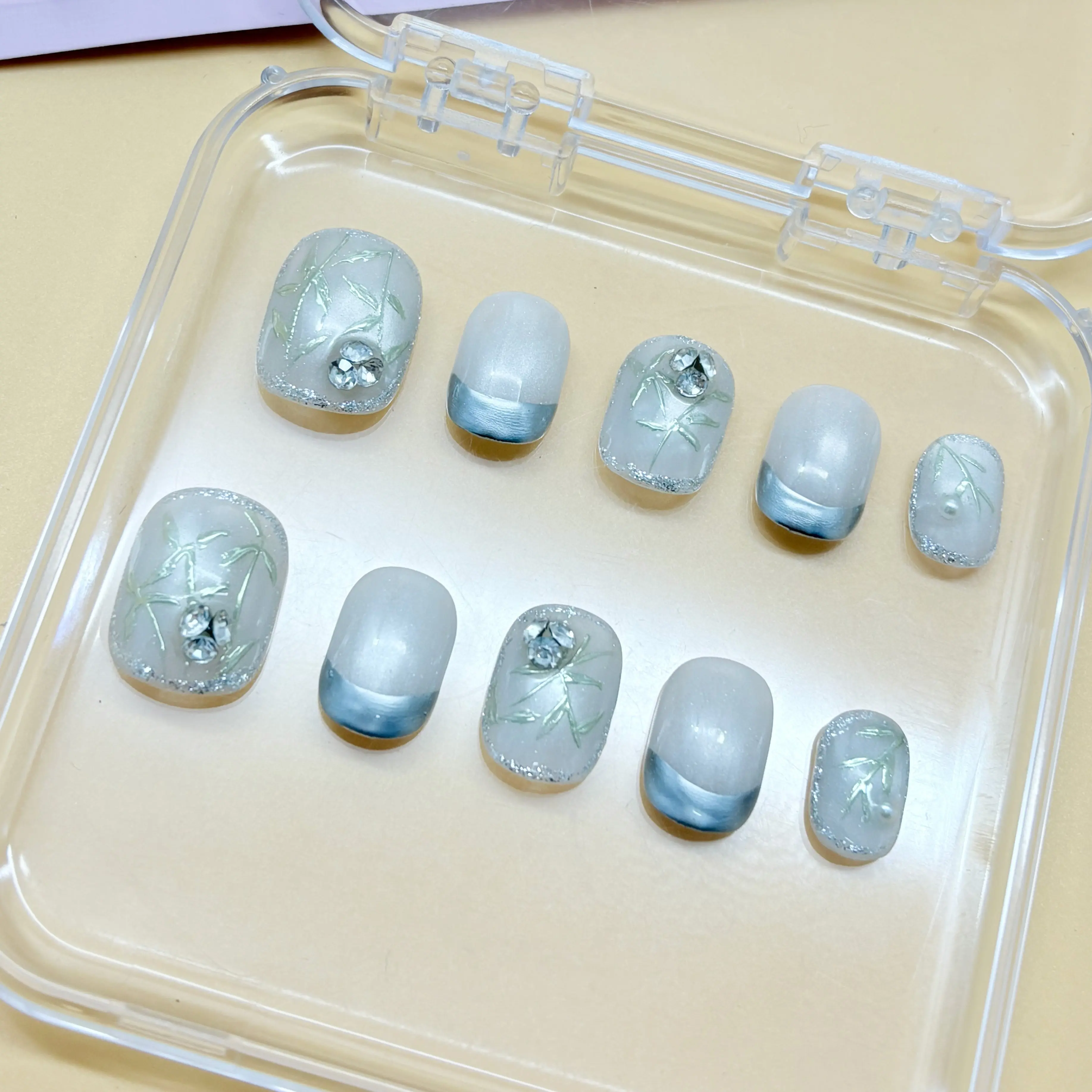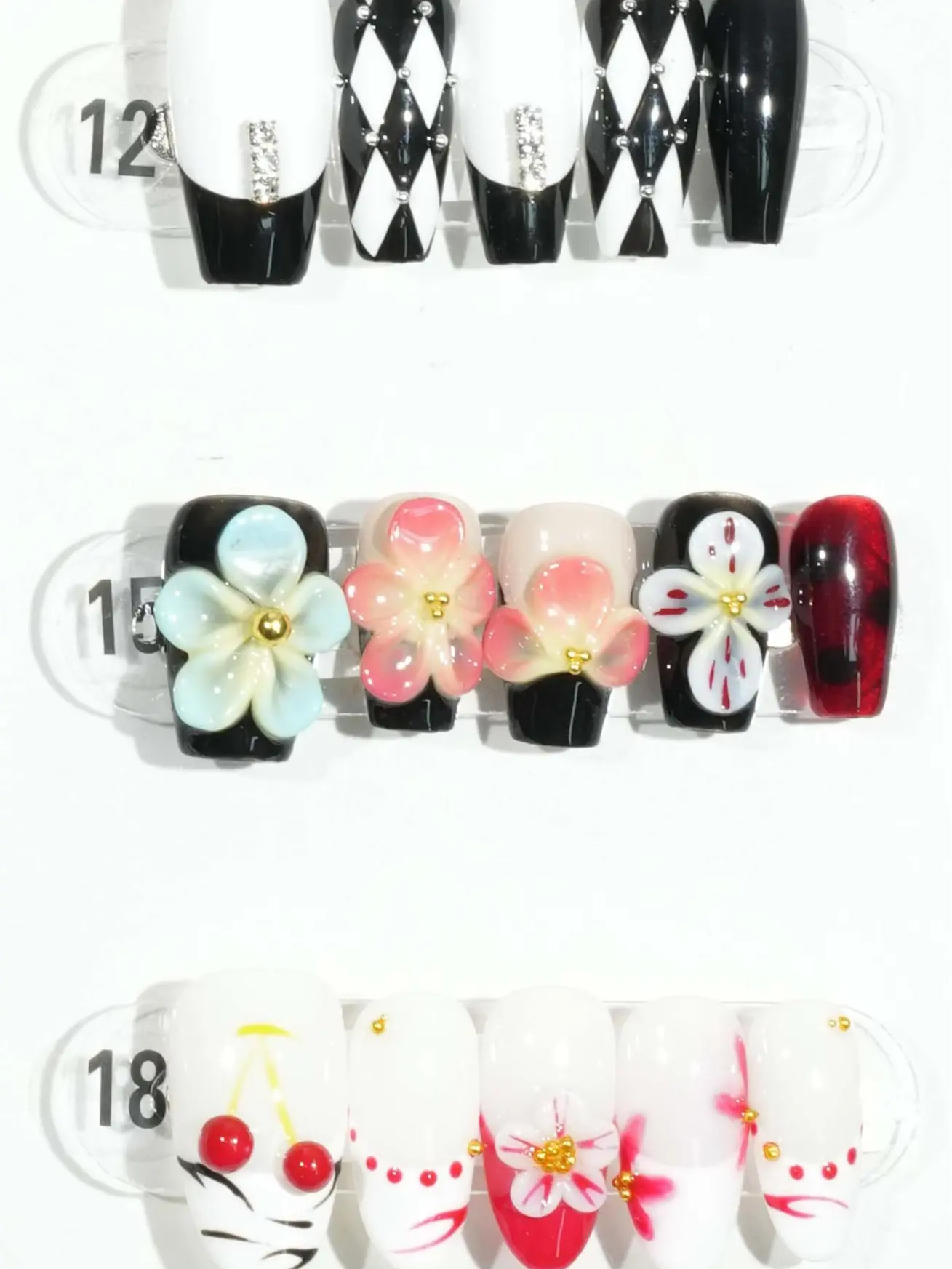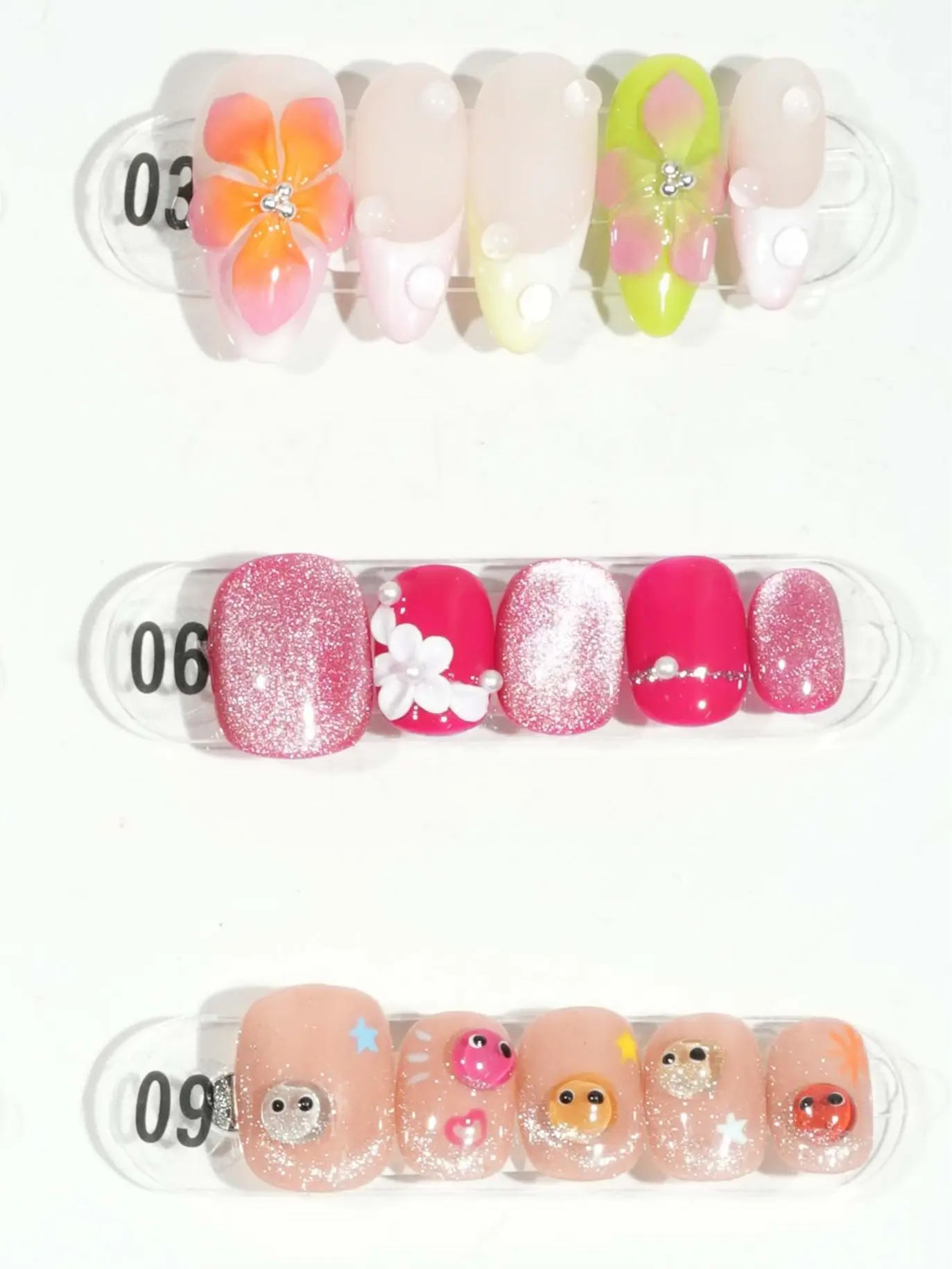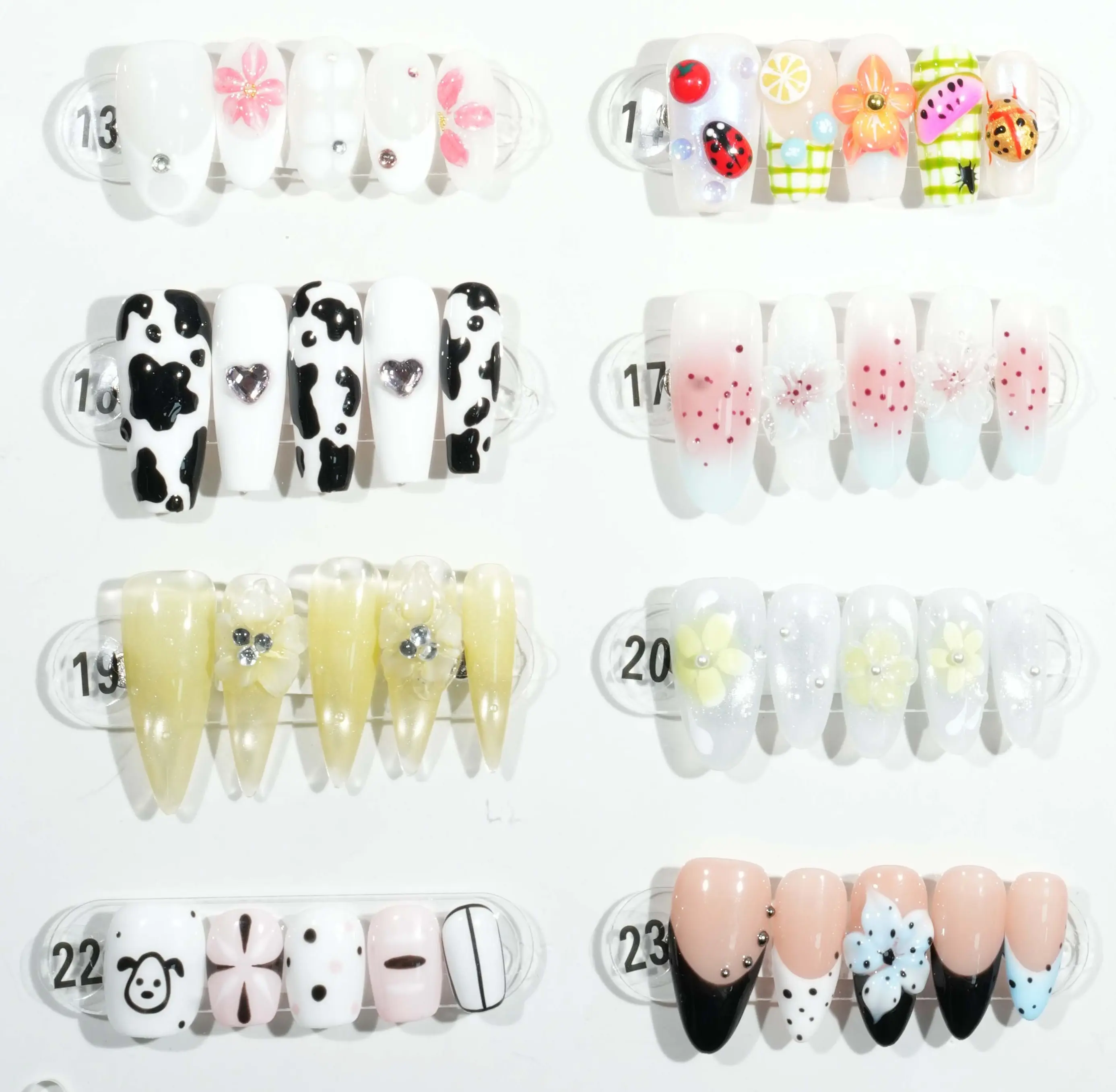 This exhibition panel showcases 24 nail art designs, each featuring unique styles and vibrant colors. From minimalist monochrome to intricate patterns, from adorable cartoon designs to trendy abstract art, every piece embodies distinct personalities and aesthetics. For instance, the 16th designβ€”a cow-print themed wearable nailβ€”combines playful charm with contemporary flair. These designs are perfect for everyday wear and can also add a stylish touch to special occasions, catering to customers' diverse nail art needs.The complimentary four-piece set contains jelly glue for DIY projects.