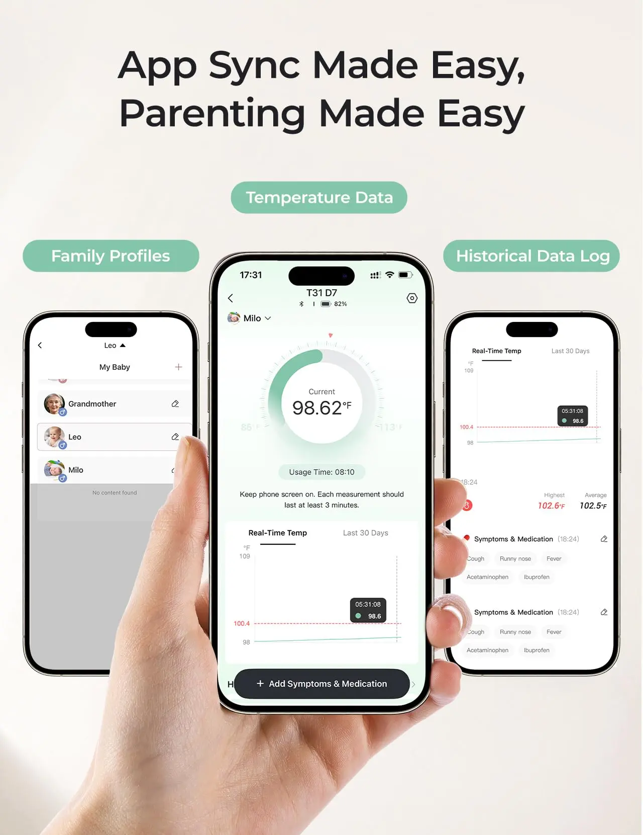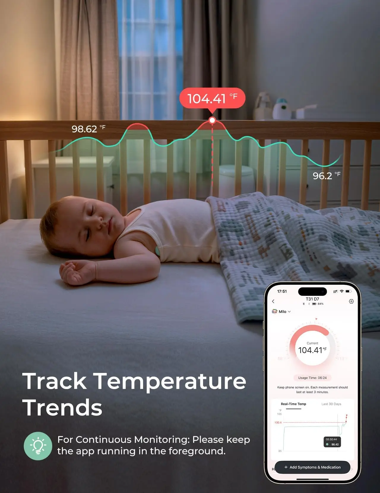 ·【Continuous Monitoring & Temperature Trend Tracking】This smart baby thermometer continuously monitors temperature while connected to the Momcozy app in the foreground.Temperature trend charts are generated automatically, making it easy to track changes over time.Parents can also manually record symptoms for more complete monitoring.