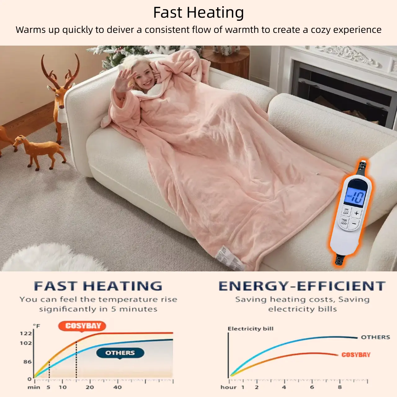 • 10 heating levels and 1-12 time settings for customizable coziness. AUTO-SHUT OFF in 3 hours if no time set. Advanced heating wire technology ensures precise temperature control, safer warmth. Tested in Cosybay Intertek-Recognized Satellite Lab with 74 safety tests. Enjoy personalized warmth without compromising safety.