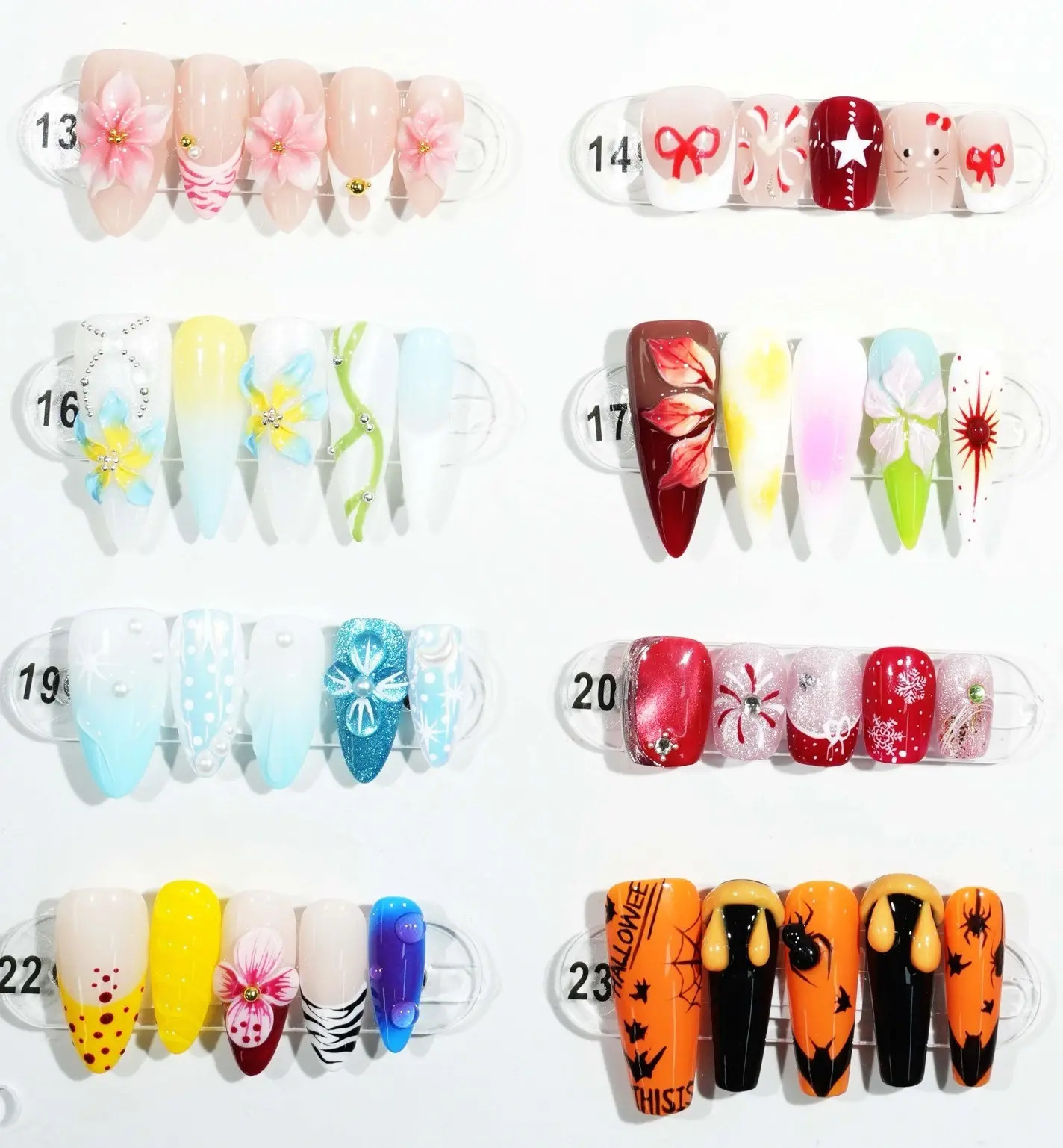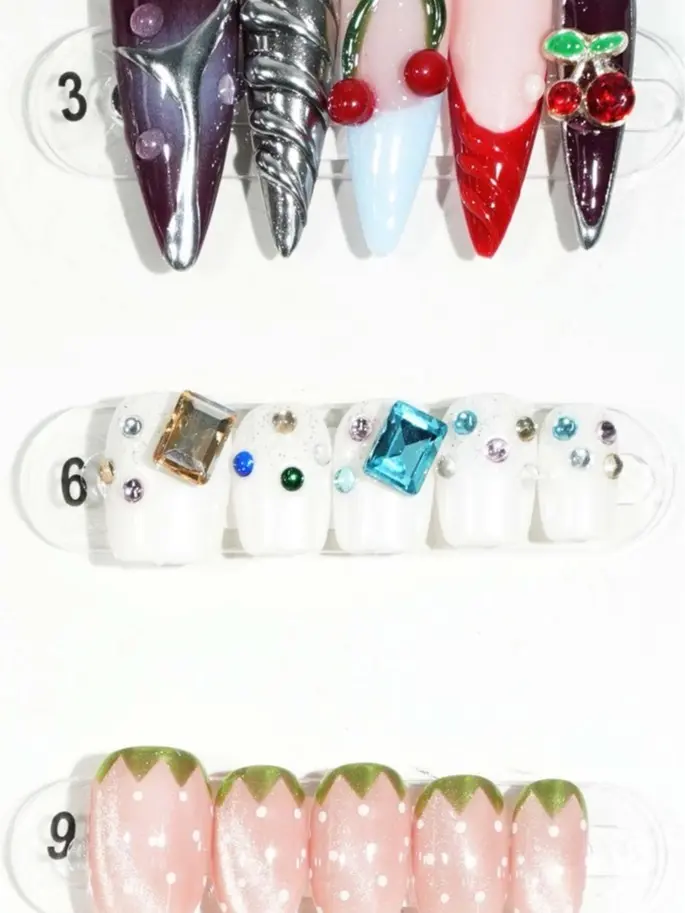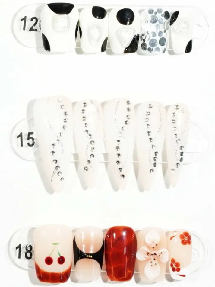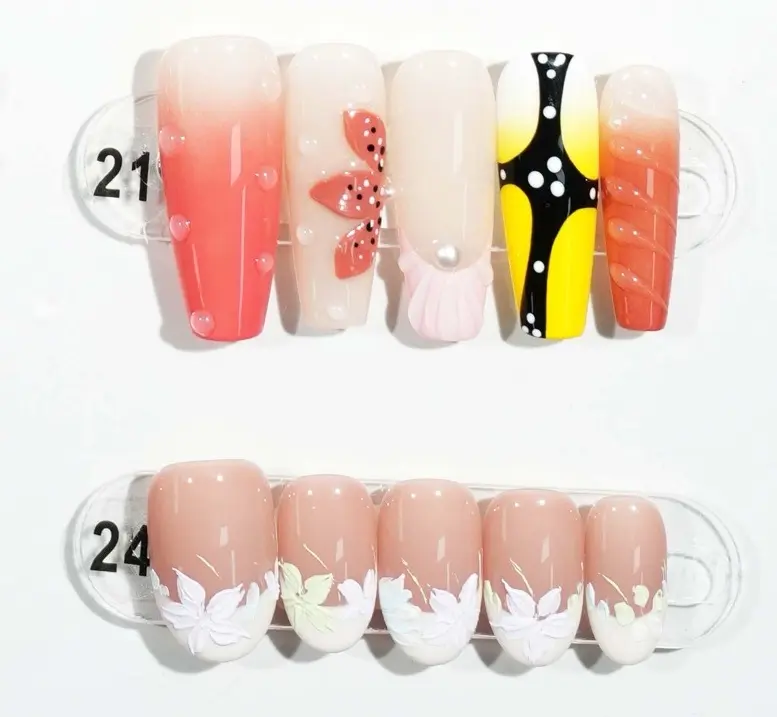 The exhibition board showcases 24 nail art stickers, each a creative expression of unique style and personality. These designs range from minimalist to intricate, featuring vibrant colors and delicate details, offering customers a wide selection. Whether for everyday wear or special occasions, these stickers effortlessly elevate your overall look.The complimentary four-piece set contains jelly glue for DIY projects.