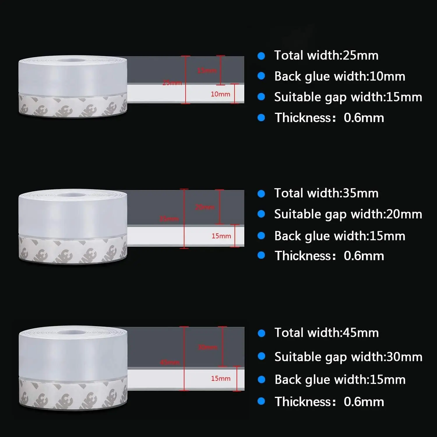 【Width Selection】The total length of the sealing strip is 16 feet, thickness of 0.02 inch and can be cut to your needs. A gap of 0-15mm is recommended to select a 25mm width seal; a 0-20mm gap is recommended to select a 35mm width seal; a 0-30mm gap is recommended to select a 45mm width seal.