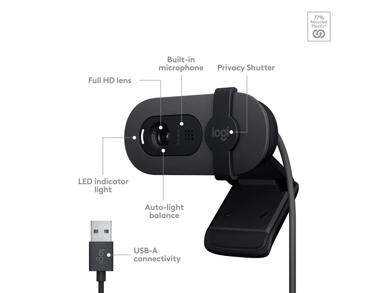 Logitech Brio 100 Full HD Webcam for Meetings and Streaming, Auto-Light Balance, Built-In Mic, Privacy Shutter, USB-A, for Microsoft Teams, Google Meet, Zoom and More - Graphite