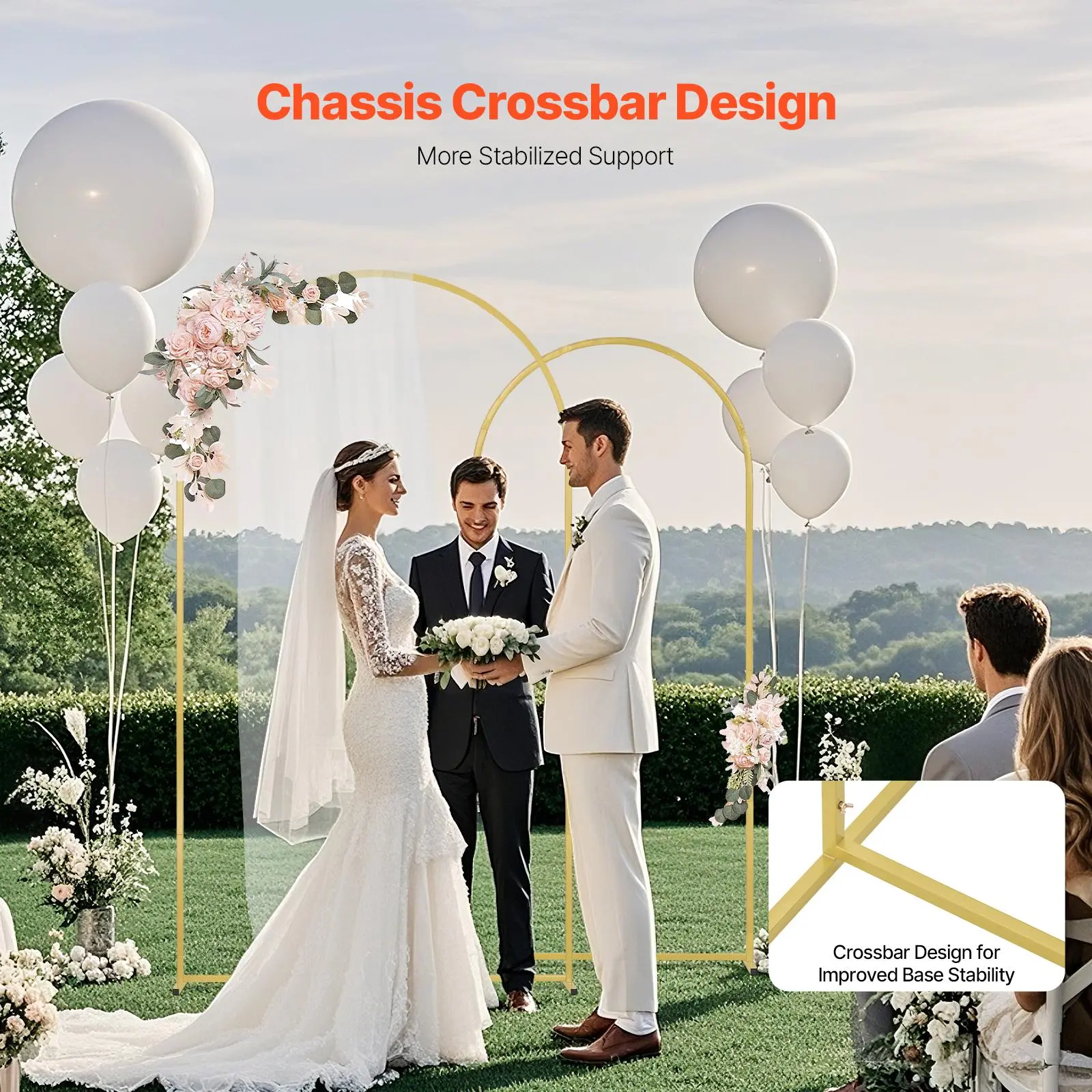 ⢠Enhanced Stability: The wedding arch backdrop standâs base features a cross-bar design that reinforces the structure, providing solid support to keep the arch secure during wedding events. Say goodbye to shake stand!