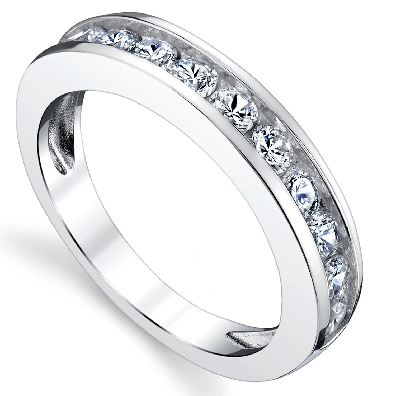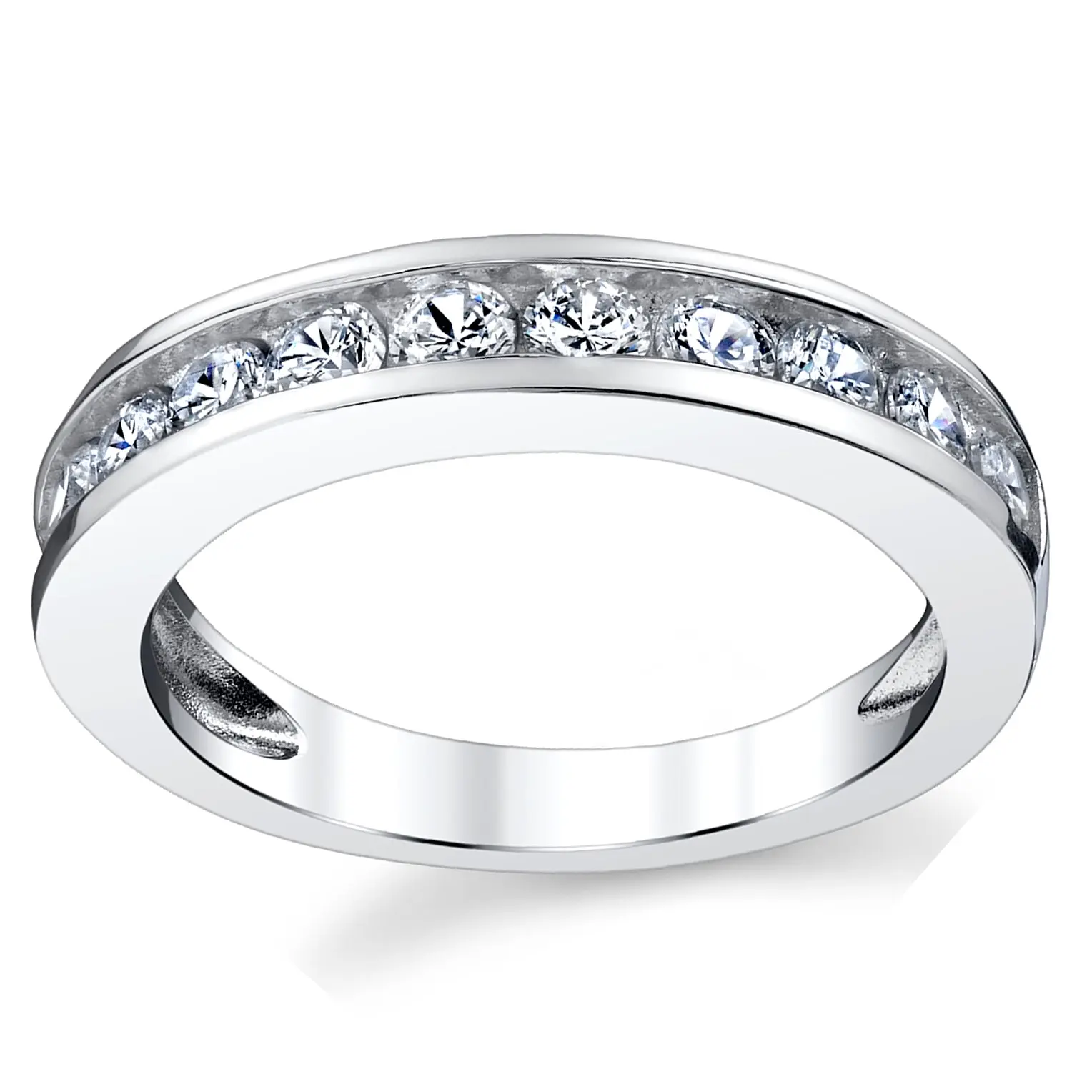 Signify your devotion with this handsome and ornate cubic zirconia wedding band. Crafted of rhodium plating over silver, this wedding band offers 11 channel-set round-cut cubic zirconia stones shining stunningly with a high polish finish. complimentary ring box included with purchase.