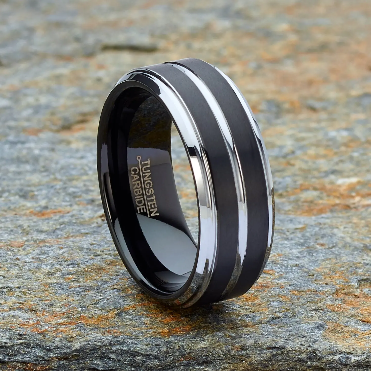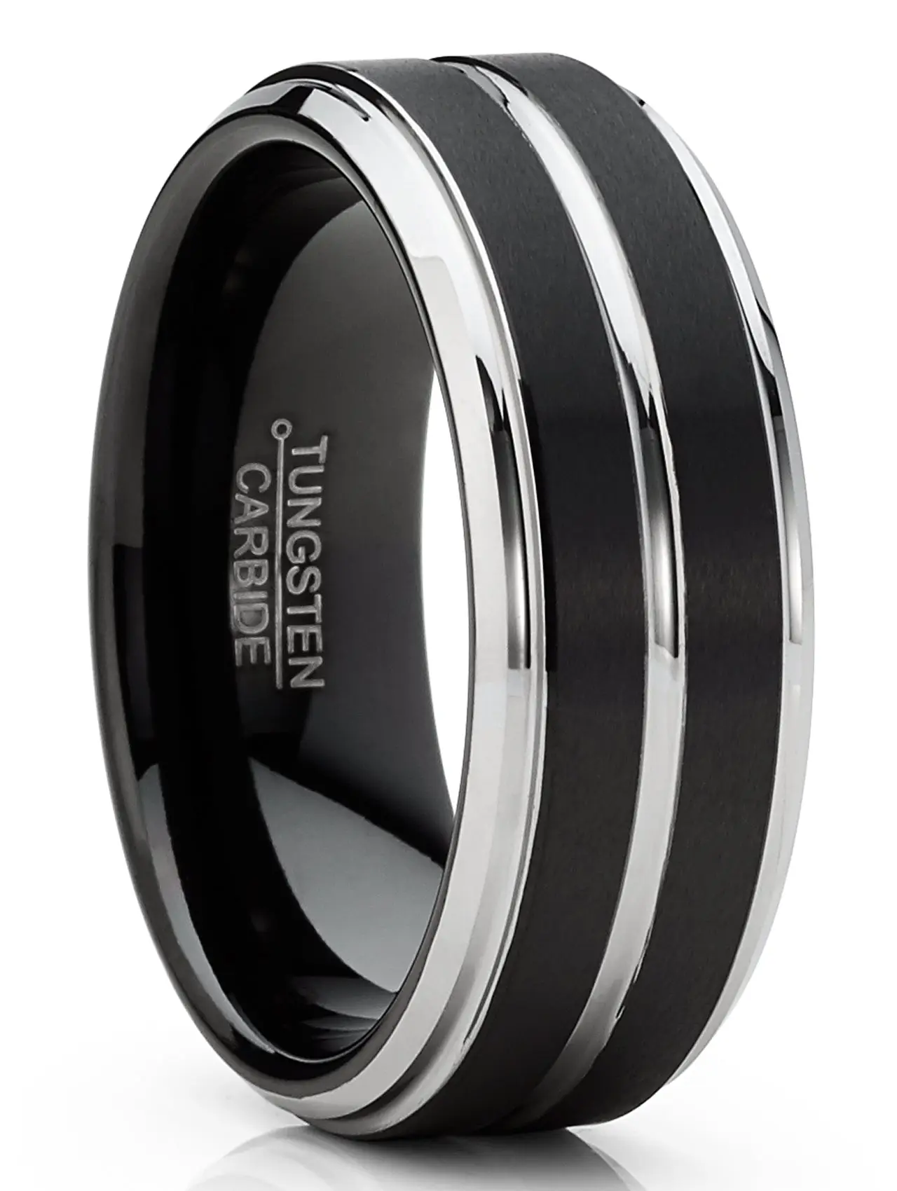 This men's two-tone Tungsten ring features a black matte, flat-top, brushed center band with grooves and beveled edges. Pick from two classic colors, silvertone or rose-goldtone.