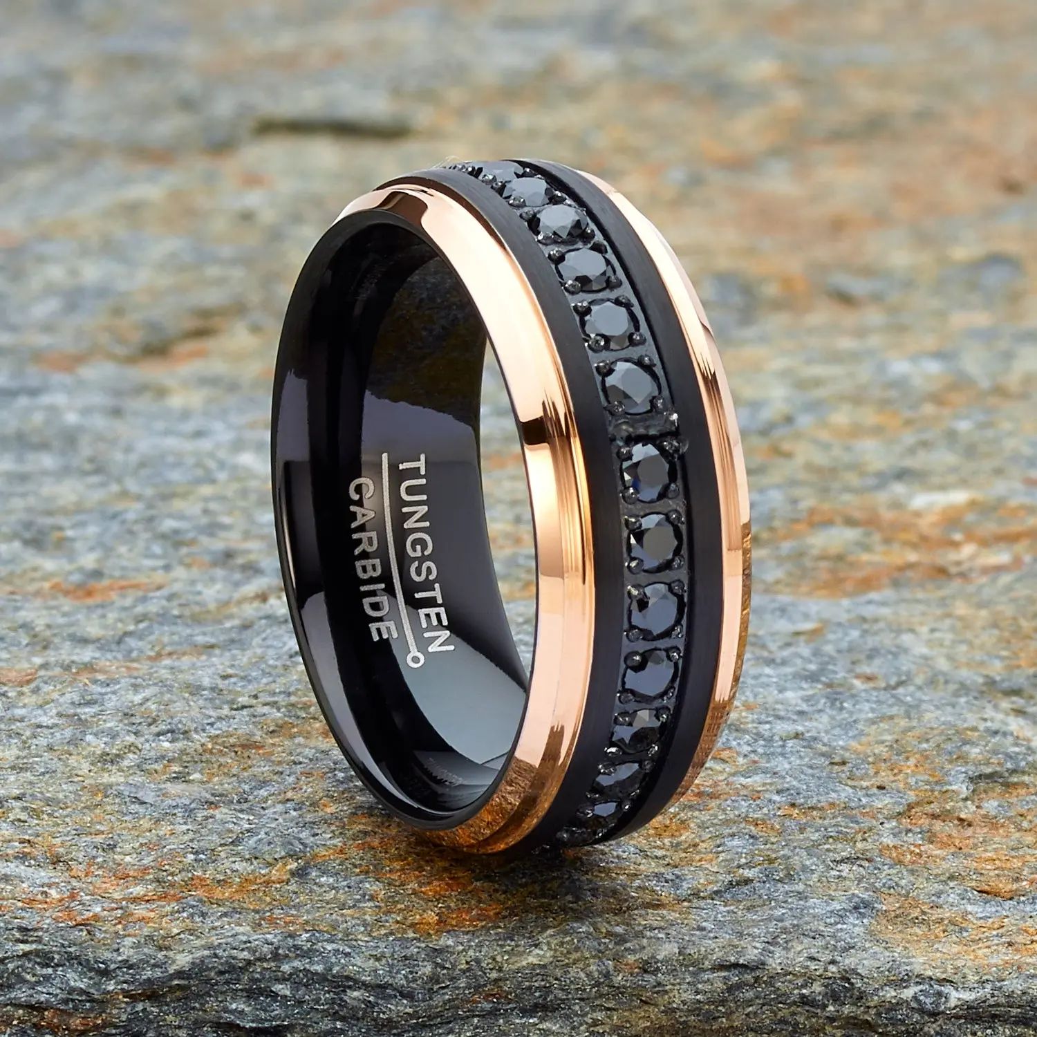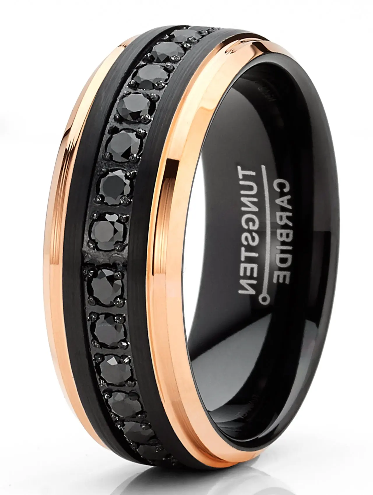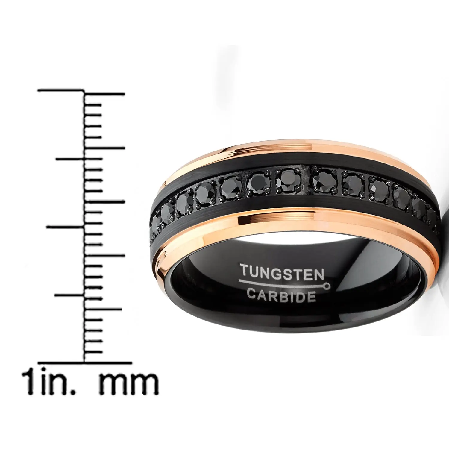 This men's Tungsten eternity ring features shimmering round brilliant black stones around the flat-top, brushed center, black and rose goldtone band.
