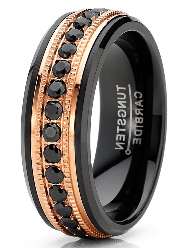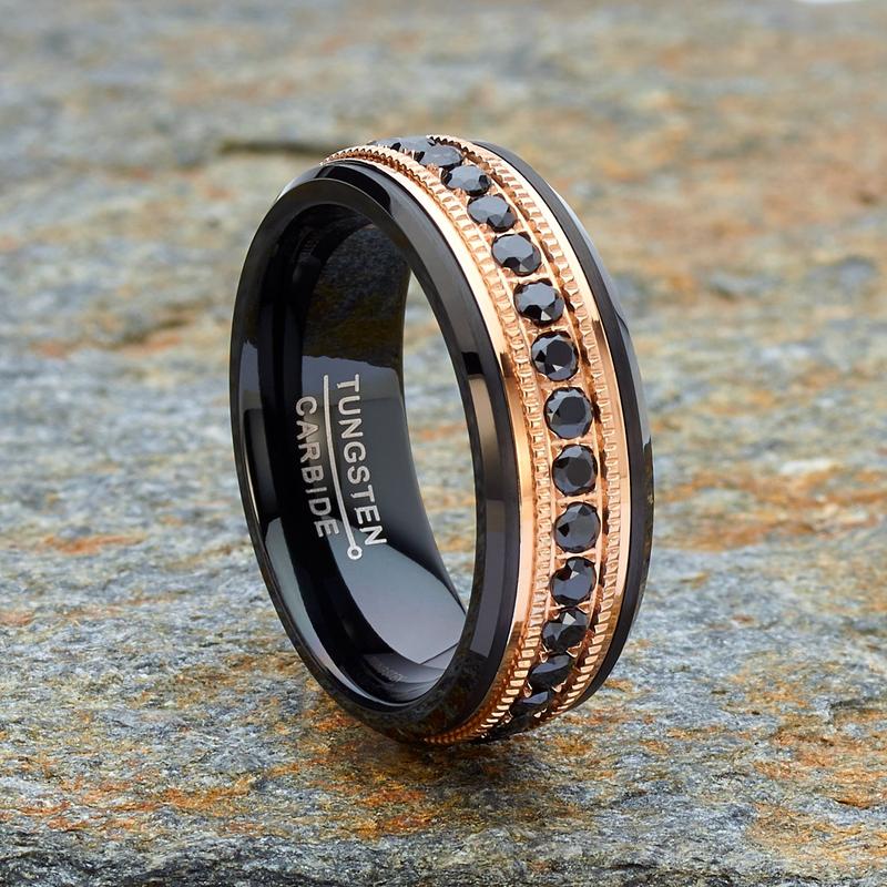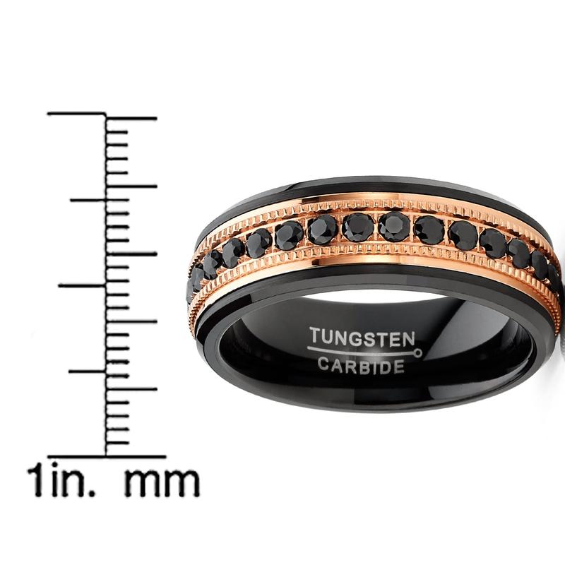 This men's Tungsten eternity ring features shimmering round brilliant black stones around rose-goldtone, milgrain center with black high polish, beveled edges.