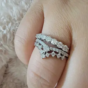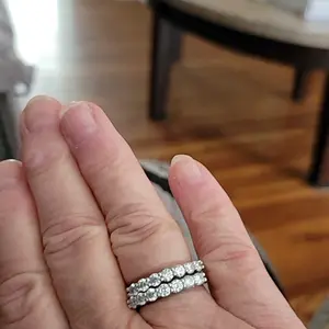 This ring beautifully matches my 14k white gold 2c t.w. engagement ring (top middle ring without tag) in an extravagant manner. The quality is so amazing. The freebies that come in the box are also helpful (ring size ruler) and this week's gift ring (the size 7 solo ring).