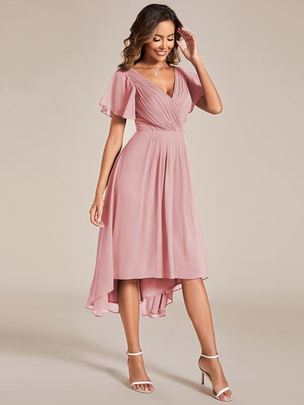 Get ready for a romantic garden wedding with the Ever-Pretty Chic V Neck Asymmetrical Hem Ruffles Sleeve Pleated Chiffon Wedding Guest Dress. This elegant dress features a V neck, ruffled sleeves, and pleated chiffon material for a touch of whimsical charm.