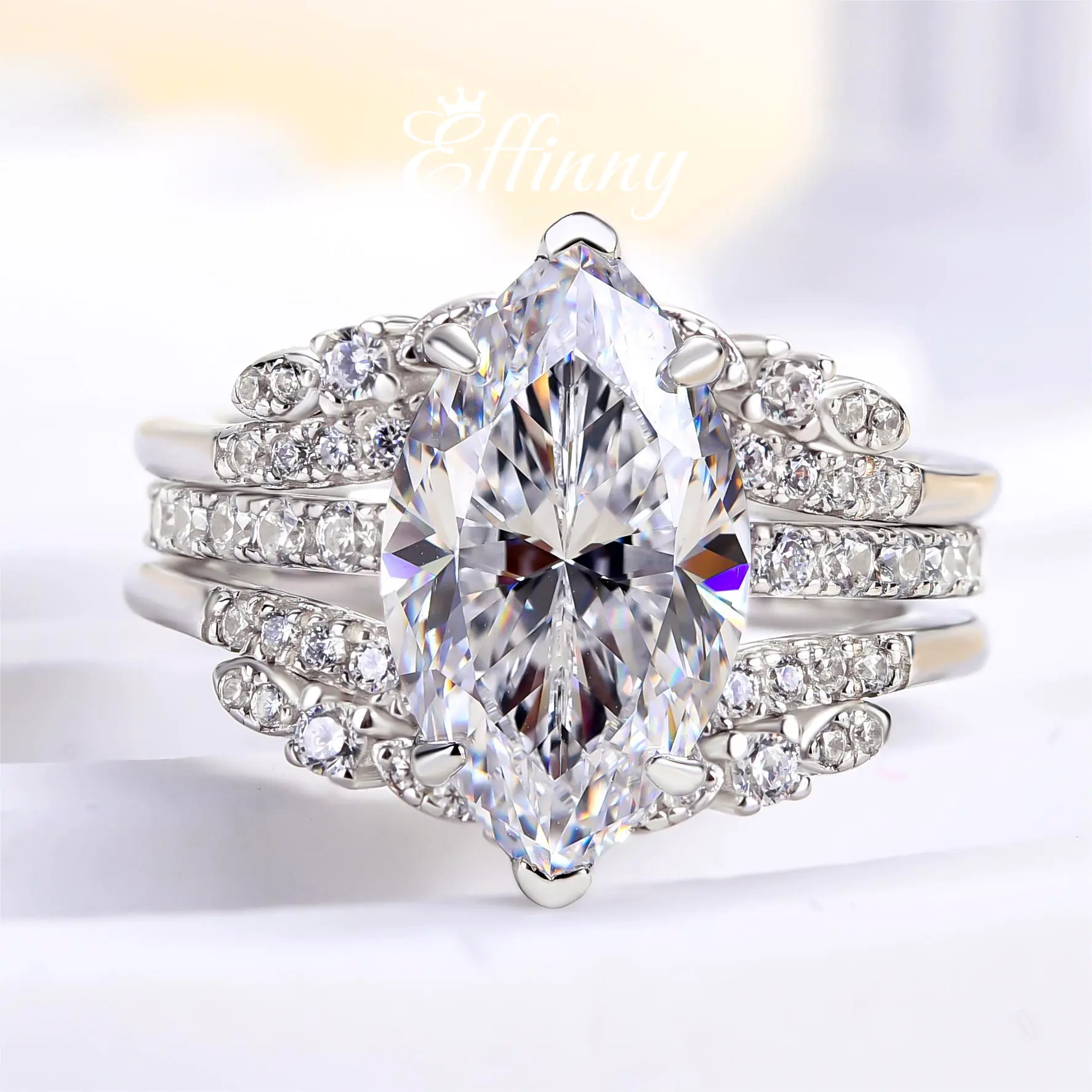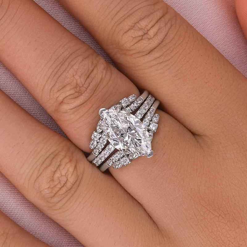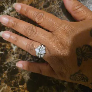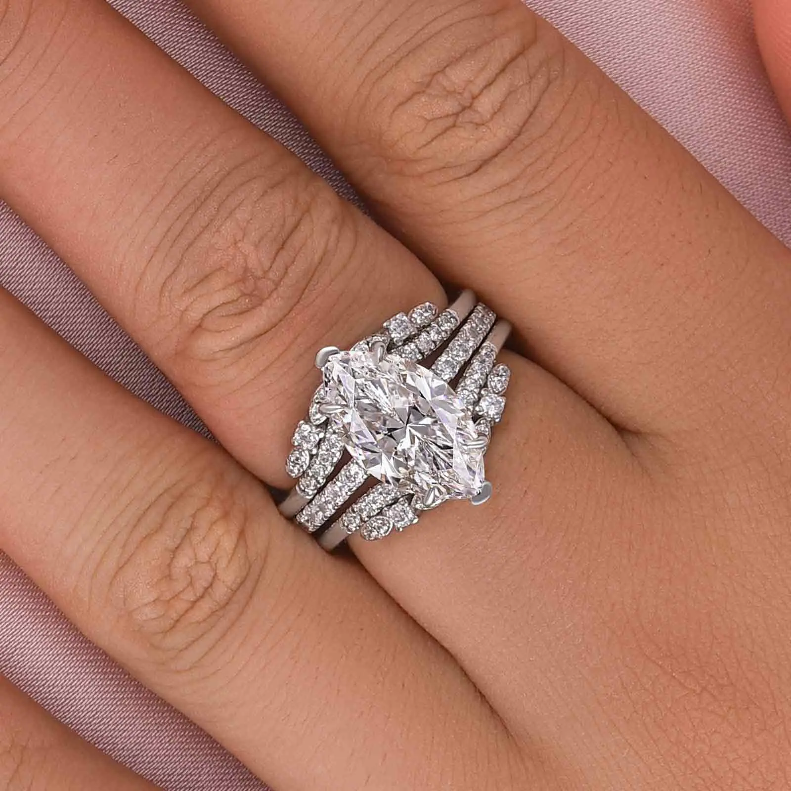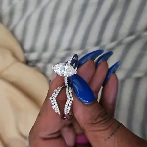 Beautiful but center stone is way too big. I love the shape but couldn’t get it in a smaller size. Looks fake.